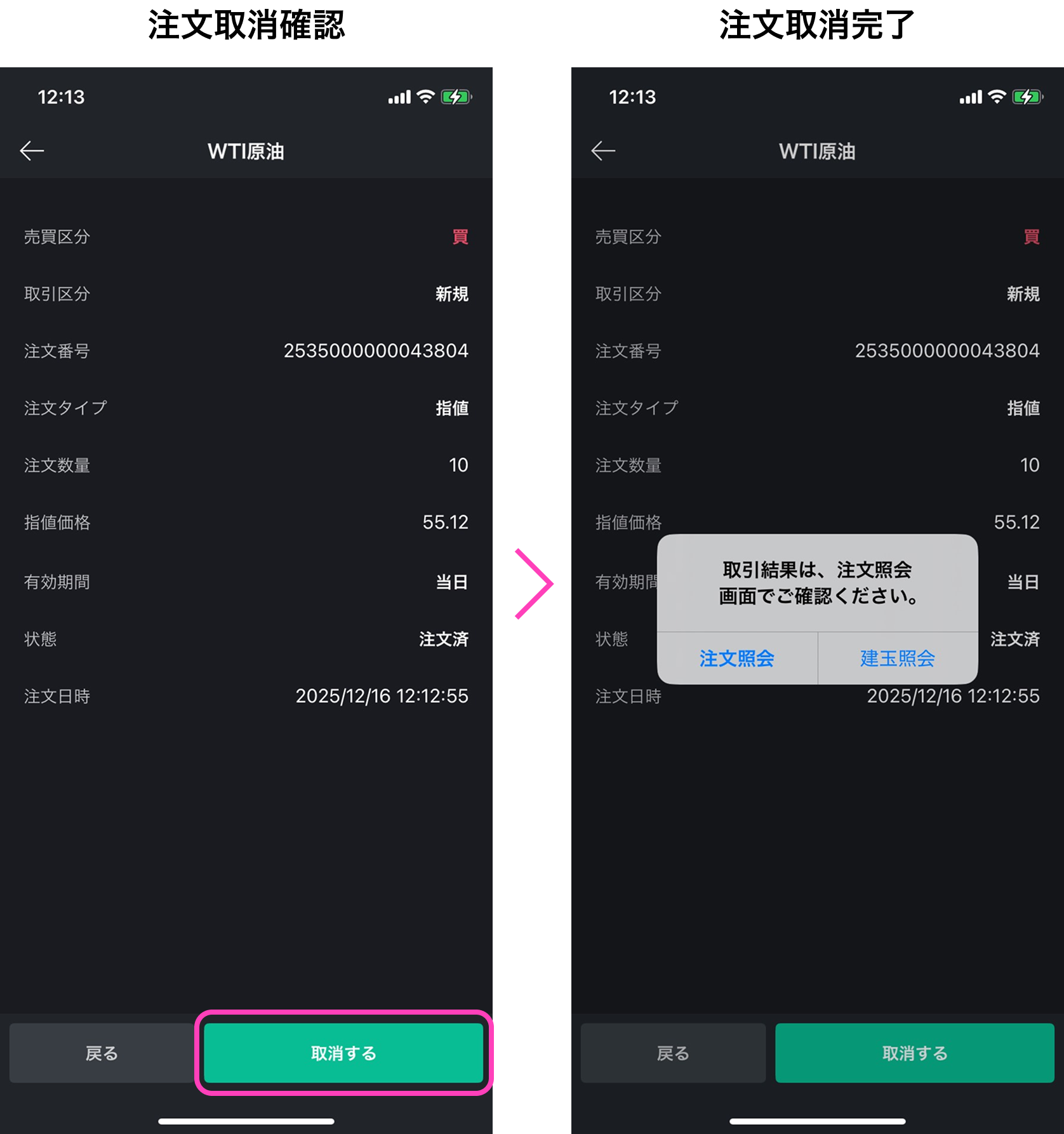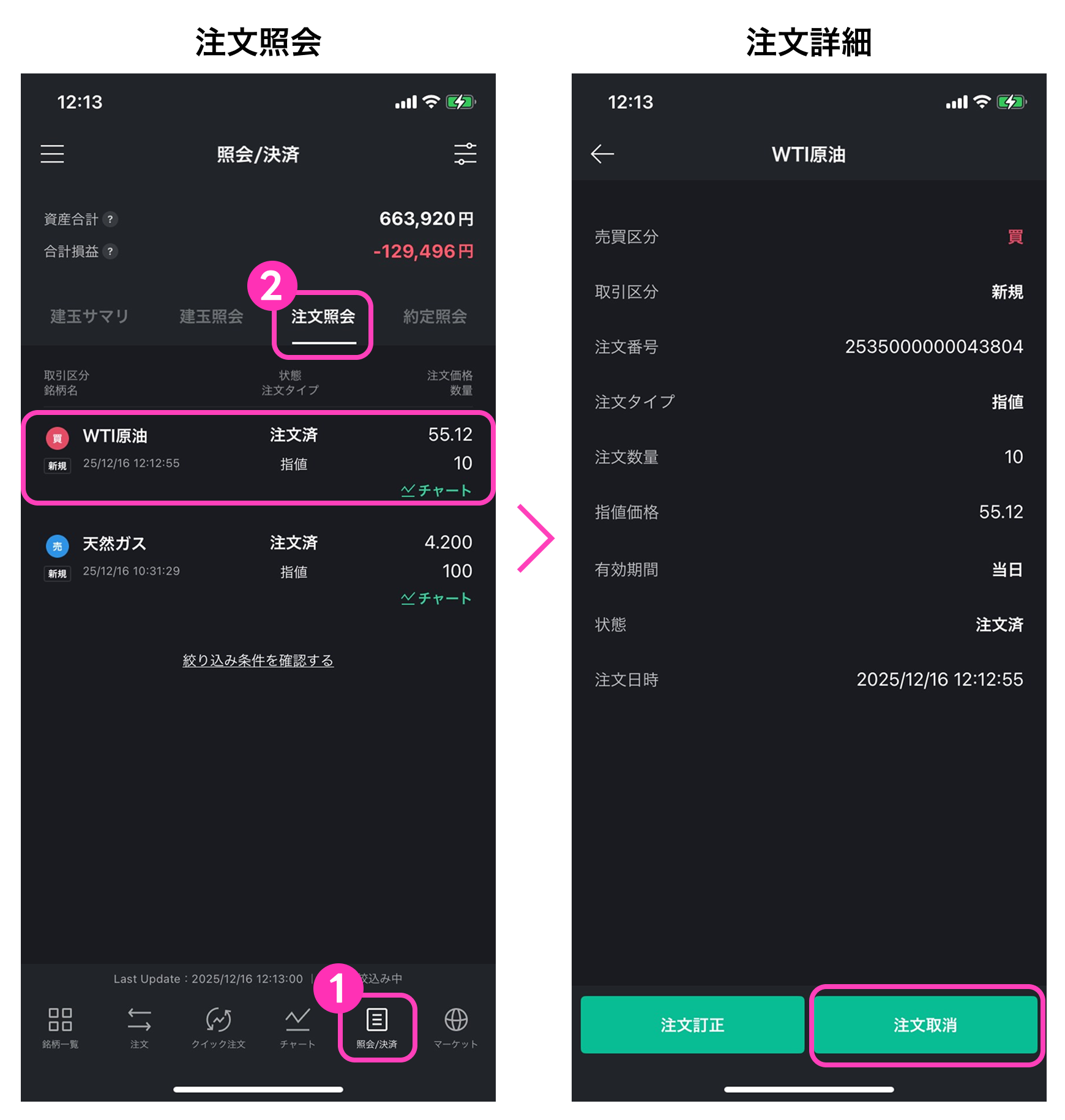 LINE CFD アプリ操作マニュアル – 注文取消 2025年12月22日 目次へ戻る 注文取消 照会決済を選択(①)し、注文照会を選択(②)することで注文照会画面へ遷移します。注文取消は、注文照会画面より、取消したい注文を選択して表示される注文詳細画面の下部に表示される「注文取消」を選択することでできます。 注文取消確認画面で内容をご確認の上、問題がなければ「取消する」を選択すると注文取消が完了します。 目次へ戻る
