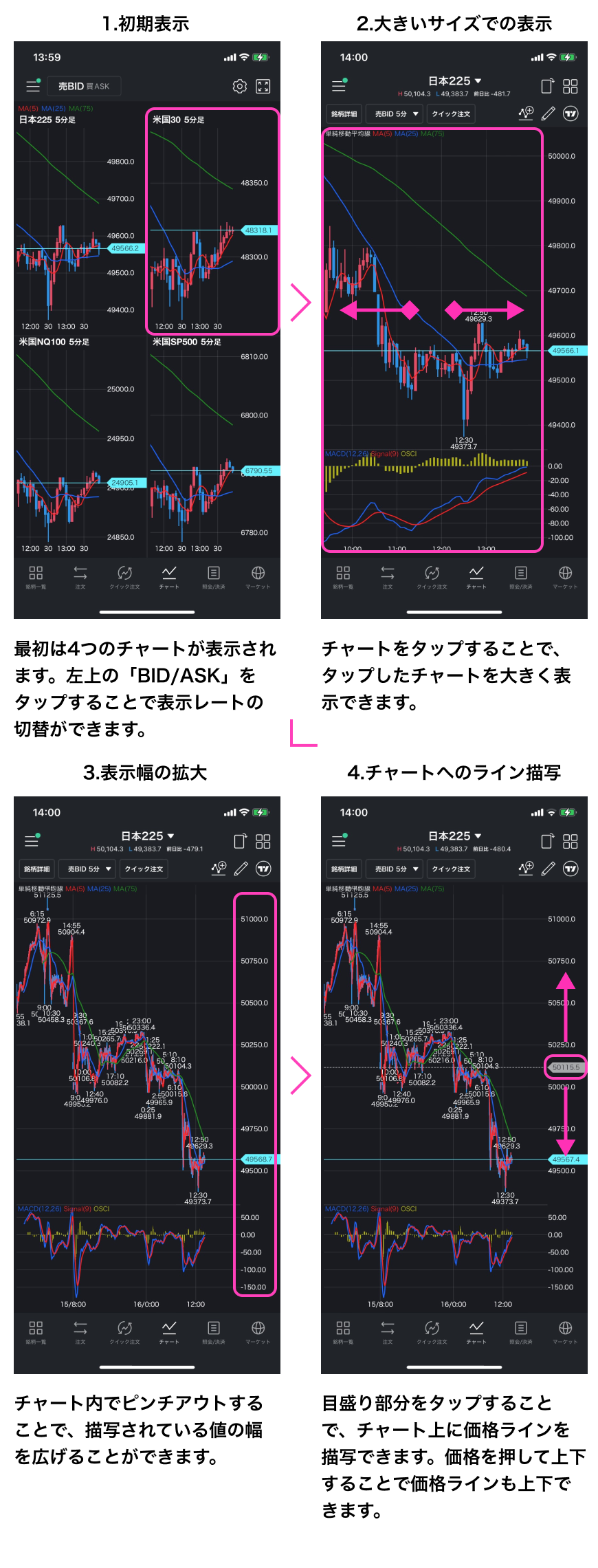 LINE CFD アプリ操作マニュアル – チャートの使い方① 2025年12月16日 目次へ戻る チャートの使い方 TradingViewの使い方はこちらをご確認ください。 4つのチャートを同時に確認することができます。表示する銘柄、表示期間、BID/ASKの切替や、チャートへのライン描写、テクニカル指標の表示などもできます。 ※2026/1/18以前の日足、週足および月足のチャートは市場実勢の価格を用いてチャート描画をしております。 目次へ戻る