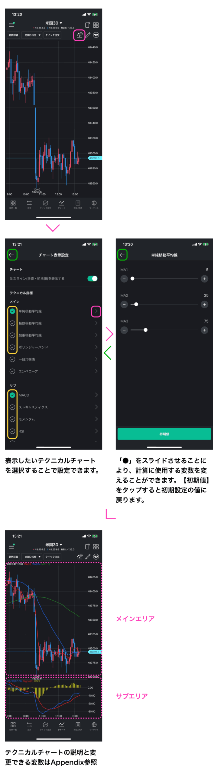LINE CFD アプリ操作マニュアル – チャートの使い方④ 2025年12月16日 目次へ戻る チャートの使い方④ TradingViewの使い方はこちらをご確認ください。 テクニカルチャートの表示方法 1チャート表示にした際に表示されるチャートアイコンをタップすることで、移動平均やボリンジャーバンド等の11種類のテクニカルチャートを表示することができます。 目次へ戻る