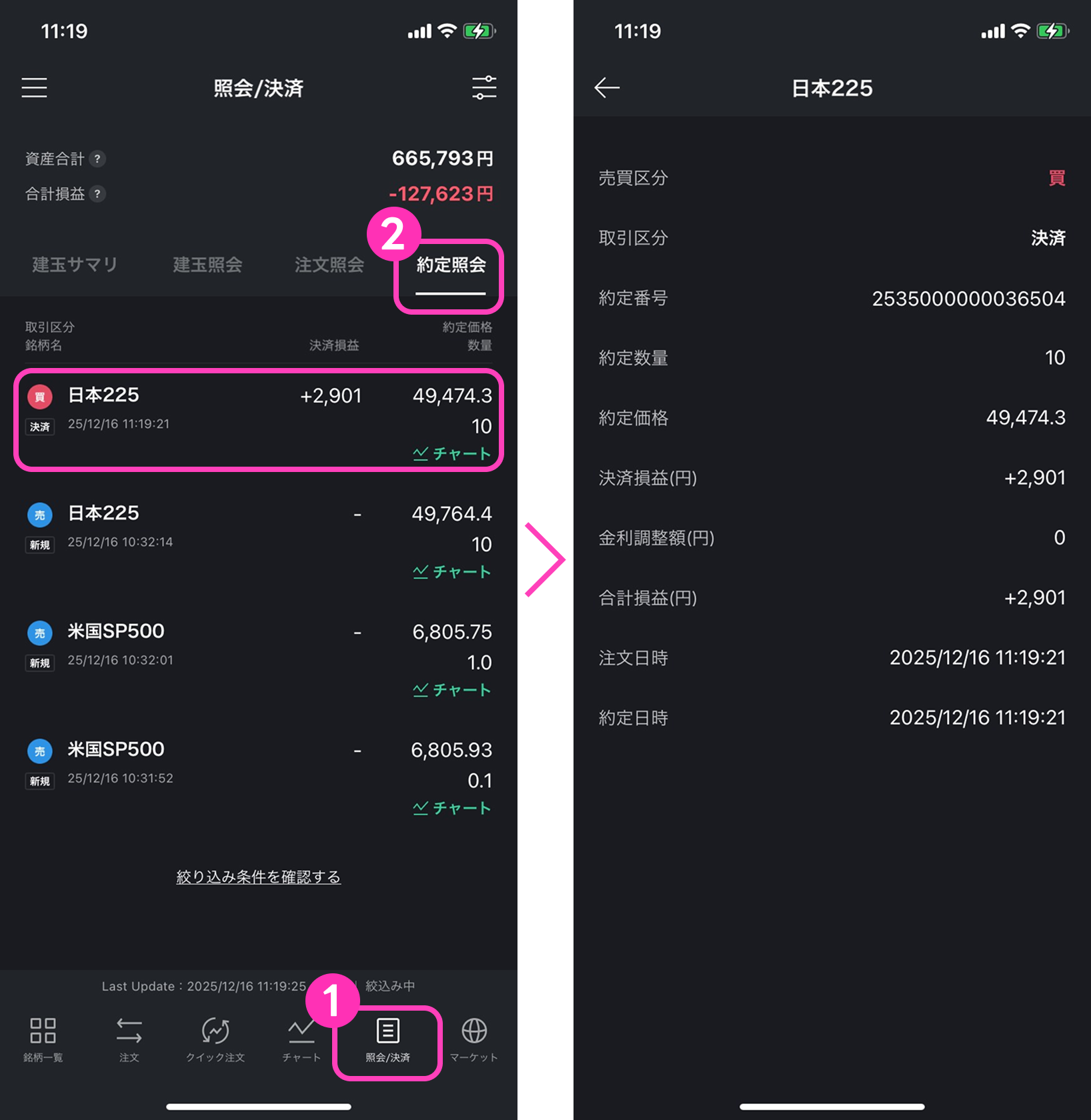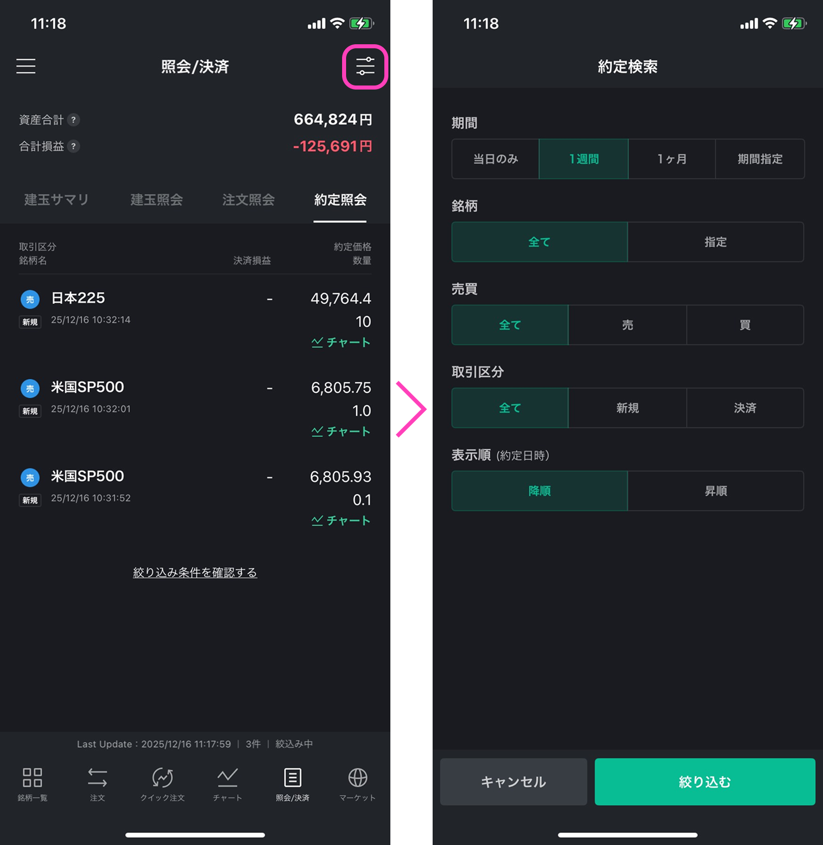 LINE CFD アプリ操作マニュアル – 約定照会 2025年12月22日 目次へ戻る 約定照会 タブメニューの「照会/決済」(①)を選択し、「約定詳細」(②)を選択することで確認できます。明細を選択することで、該当注文(新注文/決済注文)の詳細画面が表示されます。 約定照会において、画面右上のアイコンを選択することで、期間・銘柄・売買・取引区分での絞り込み、及び表示順(約定日時の昇順/降順) を指定できます。 目次へ戻る