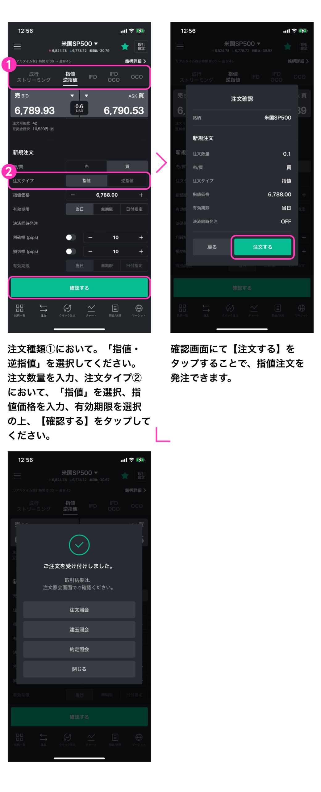 LINE CFD アプリ操作マニュアル – 指値注文 2025年12月17日 目次へ戻る 指値注文 注文価格を指定して発注する注文方法です。※決済同時発注については、こちらをご確認ください。 目次へ戻る