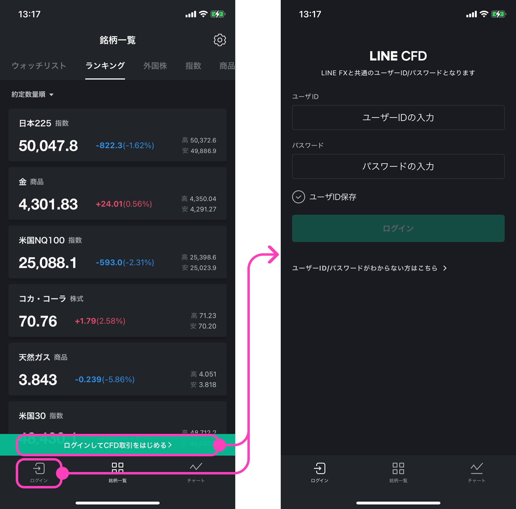 LINE CFD アプリ操作マニュアル – ログイン 2025年12月16日 目次へ戻る ログイン方法 初めてLINE CFDアプリを起動すると銘柄一覧画面が表示されます。LINE CFD口座開設済みの場合、【ログイン】 をタップすることでログイン画面へ遷移します。ユーザーIDとパスワードを入力した後、ログインボタンをタップします。 ※LINE FXと共有のユーザーID/パスワードとなります※LINE CFD口座を開設済みの方のみログイン可能となります LINE CFDの口座開設がお済みでない方はこちらから口座開設申込をお願いします。 目次へ戻る