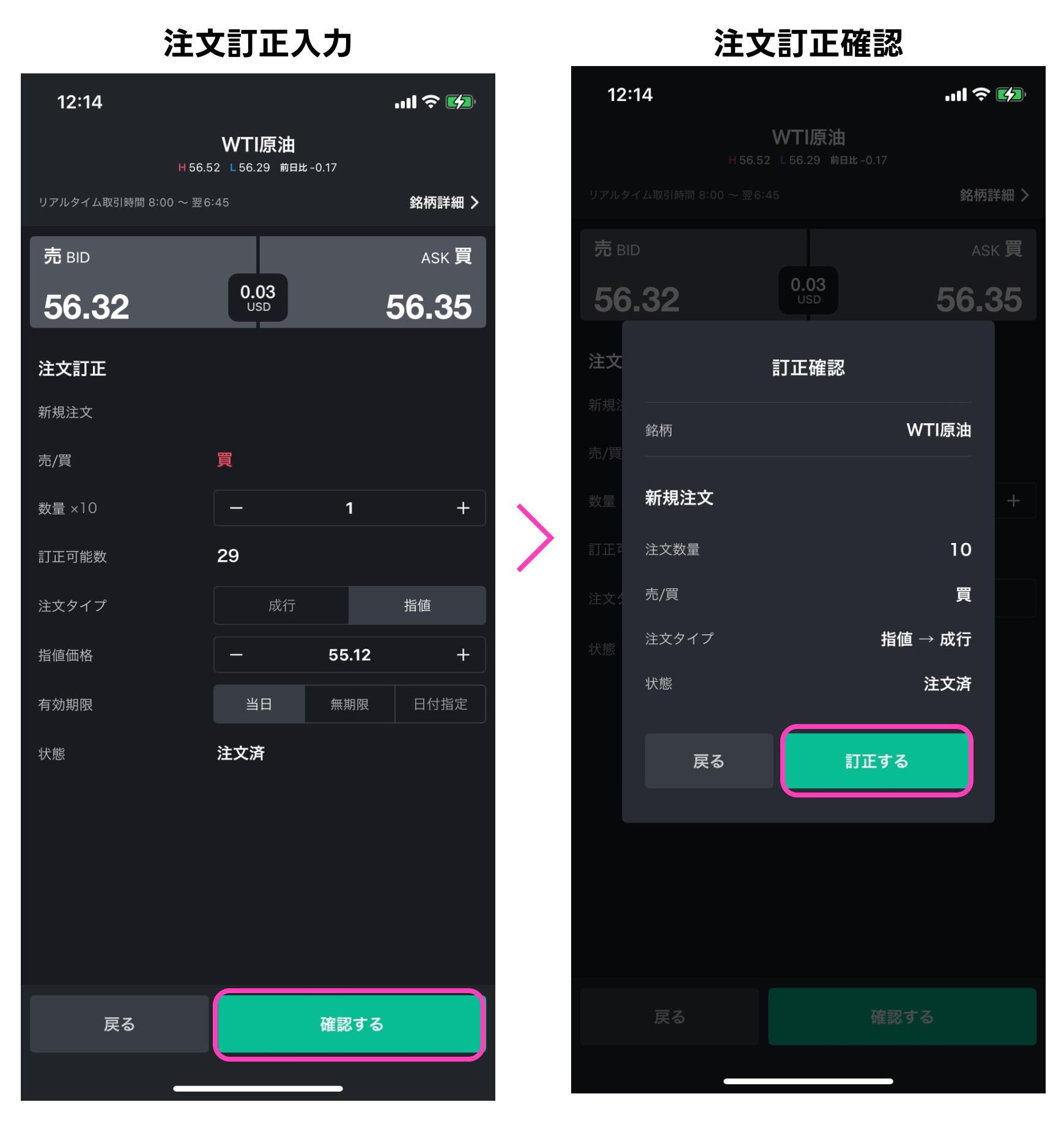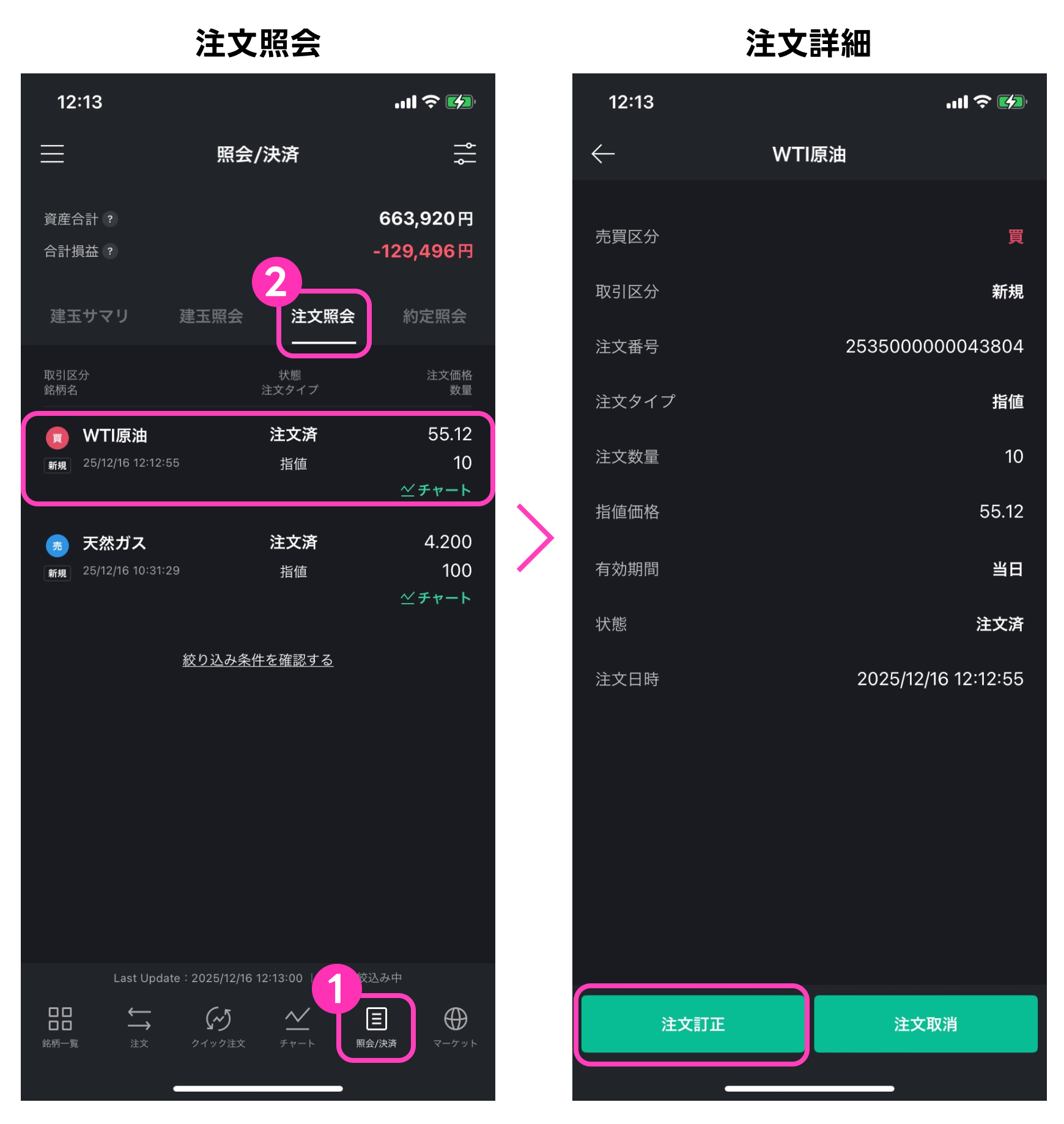 LINE CFD アプリ操作マニュアル – 注文訂正 2025年12月18日 目次へ戻る 注文訂正 照会決済を選択(①)し、注文照会を選択(②)することで注文照会画面へ遷移します。注文訂正は、注文照会画面より、訂正したい注文を選択して表示される注文詳細画面の下部に表示される「注文訂正」を選択することでできます。 注文訂正入力画面で訂正したい内容に変更した後、「確認する」を選択すると注文訂正確認画面が表示されます。内容をご確認の上、問題がなければ「訂正する」を選択すると注文訂正が完了します。 ■訂正ができる項目注文数量・注文タイプ(成行/指値)・注文価格・有効期限 目次へ戻る