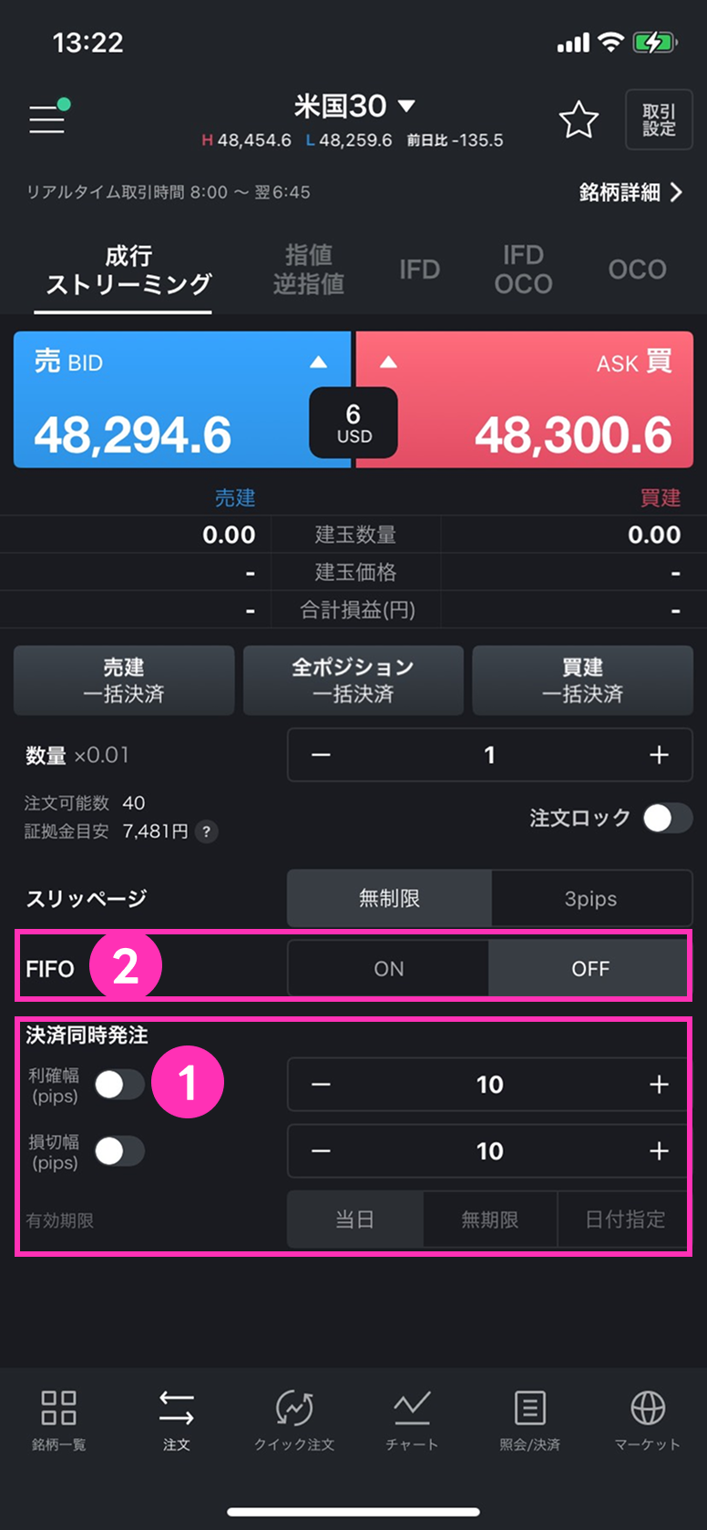 成行・ストリーミング注文では、②のFIFOが 「OFF」 の場合に限り、決済同時発注を設定できます。