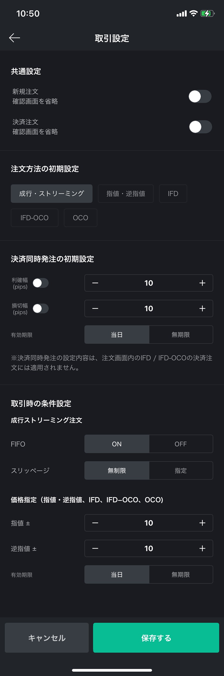※決済同時発注の設定内容は、注文画面内のIFD/IFD-OCOの決済注文には適用されないのでご注意ください。