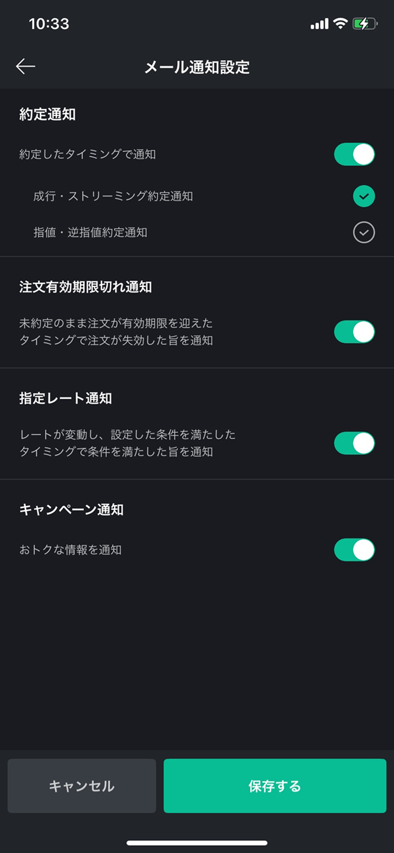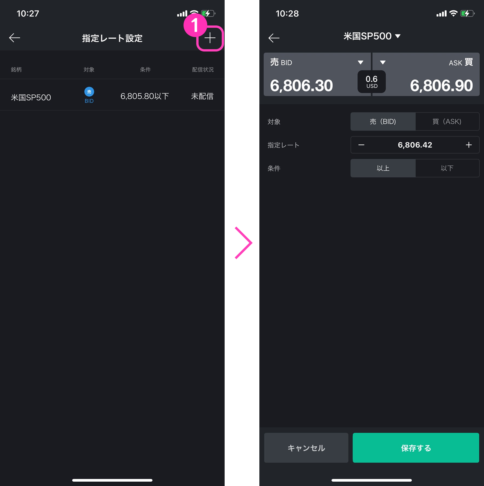 指定レート設定画面の右上の「+」を選択することで、通知を追加することができます。