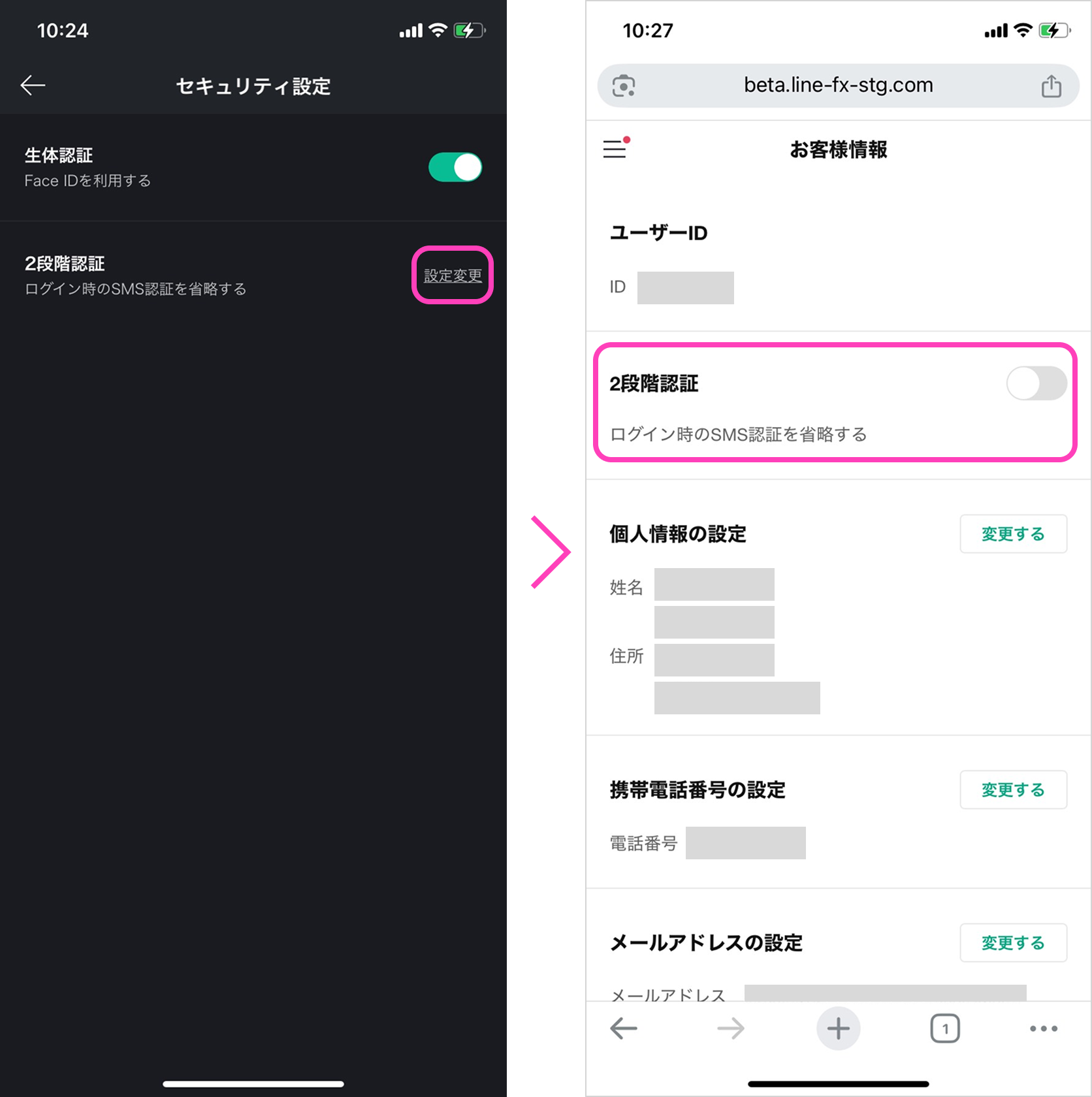 メニューから「セキュリティ設定」を選択することで、LINE CFDアプリを起動した際の生体認証の設定や2段階認証(ログイン時のSMS認証)の設定を変更できます。