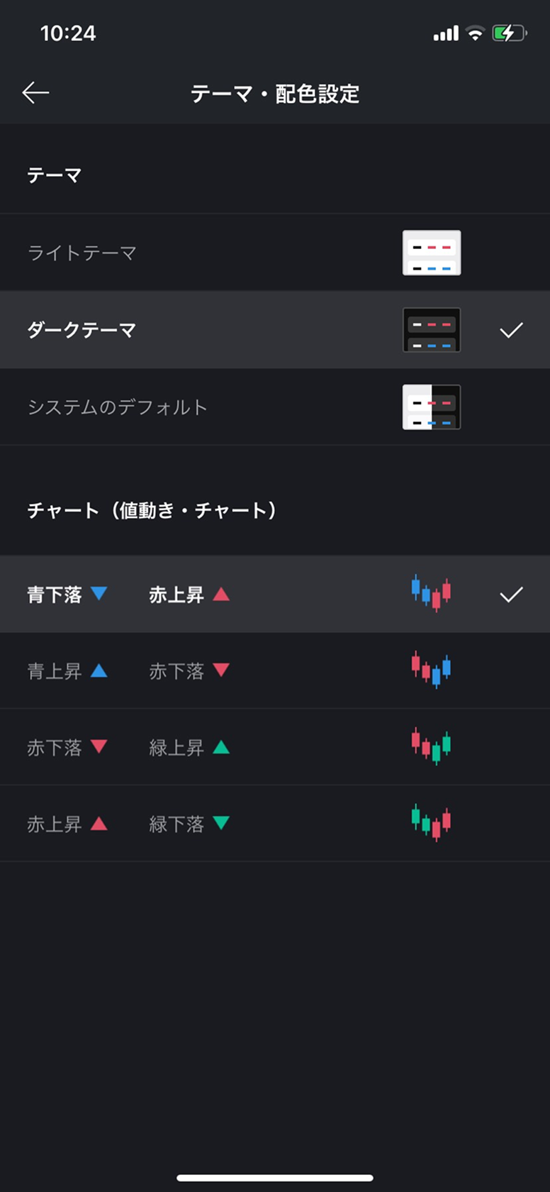 メニューから「テーマ・配色設定」を選択することで、LINE CFDアプリ内でのライトテーマ・ダークテーマの切り替えや、チャート等の配色を設定できます。