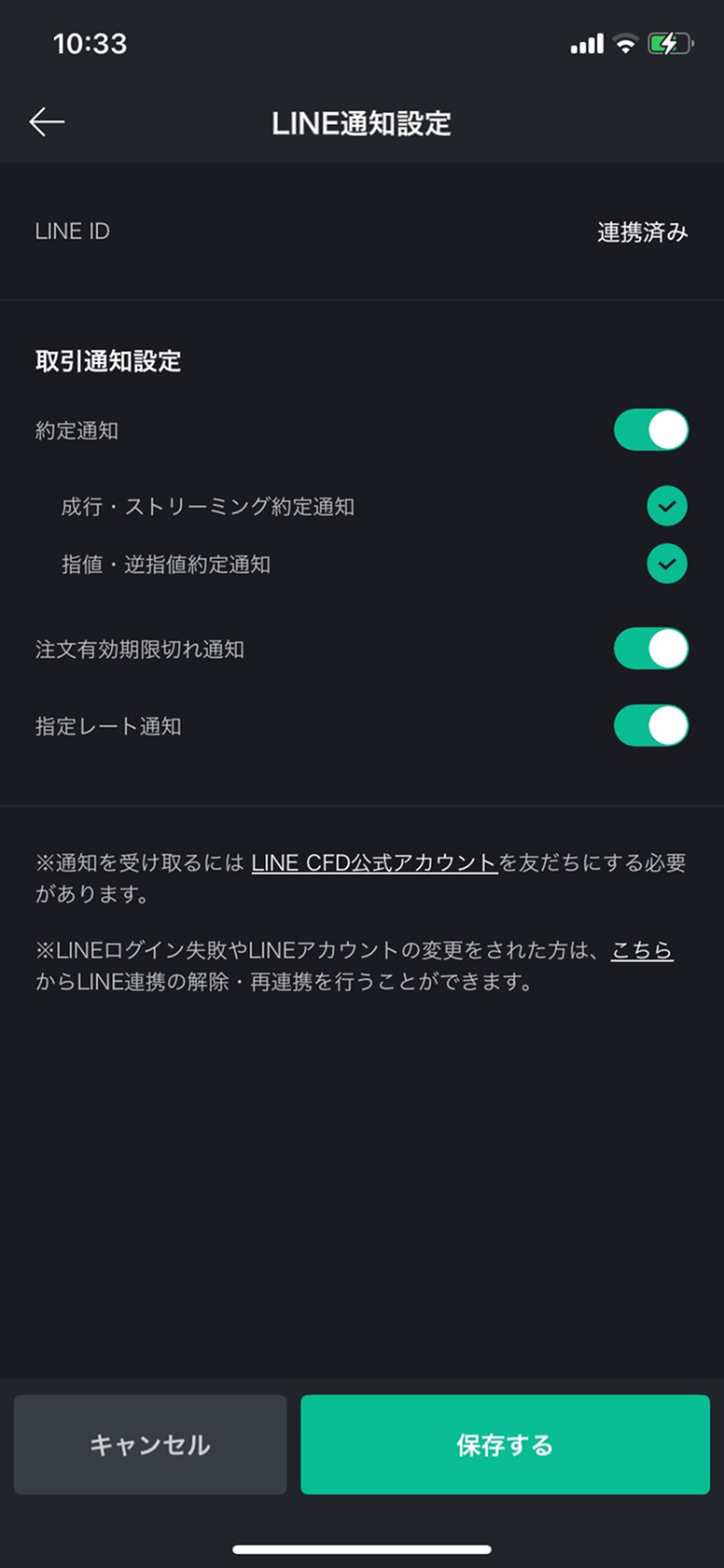 メニューから「LINE通知設定」を選択することで、LINE通知でどの種類の通知を受け取るか設定することができます。なお、通知を受け取るにはLINE CFD公式アカウントを友だちに追加する必要があります。