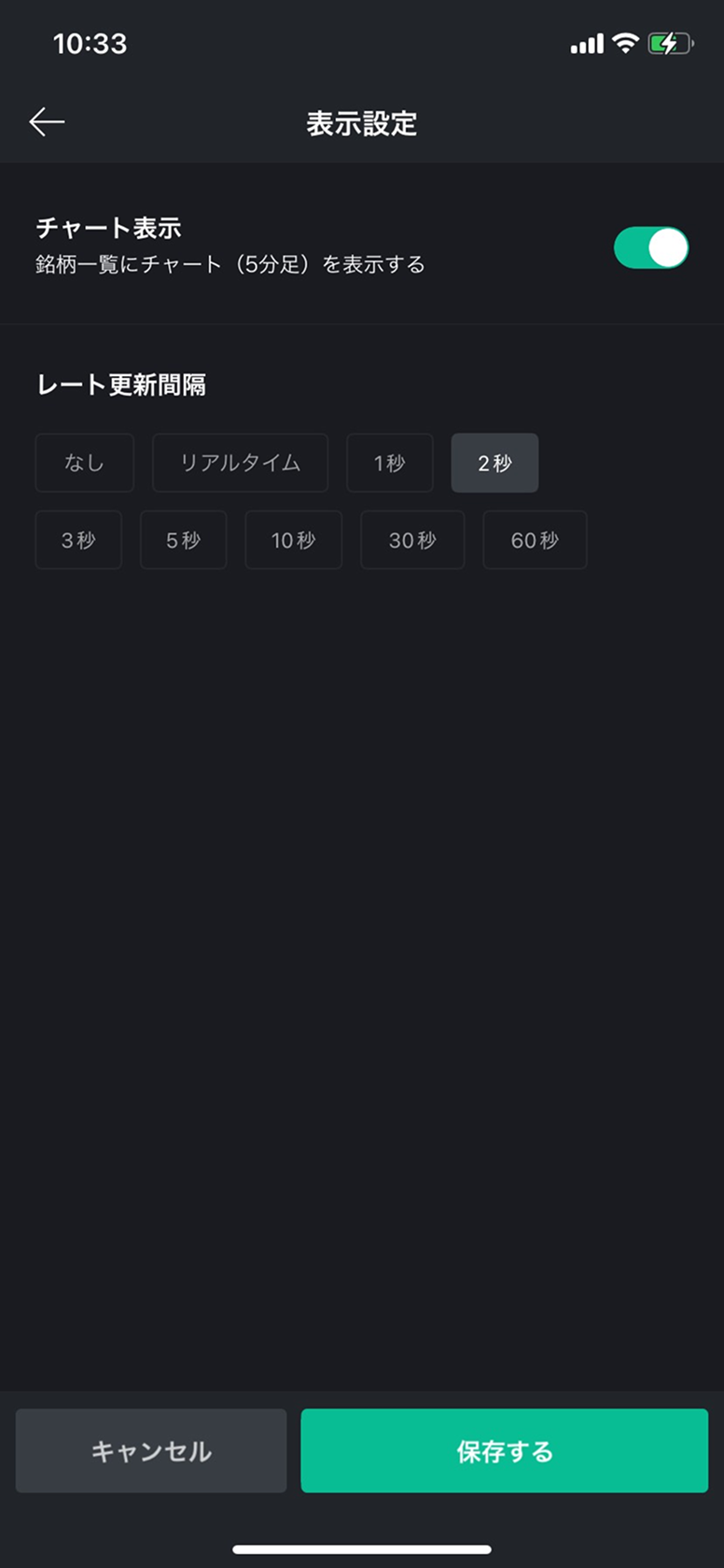 メニューから「表示設定」を選択することで、銘柄一覧でのチャート表示ON/OFFやレートの更新間隔を設定することができます。