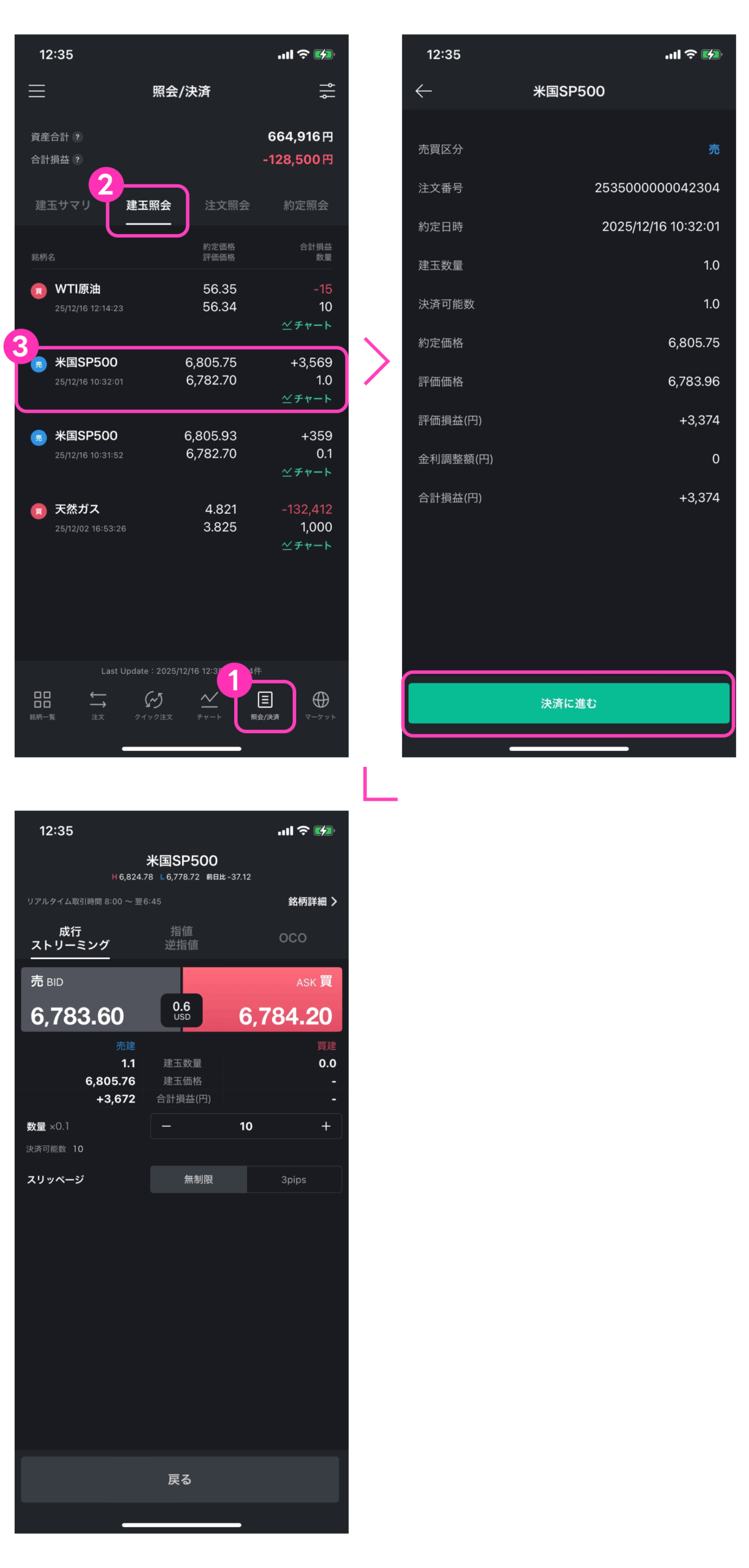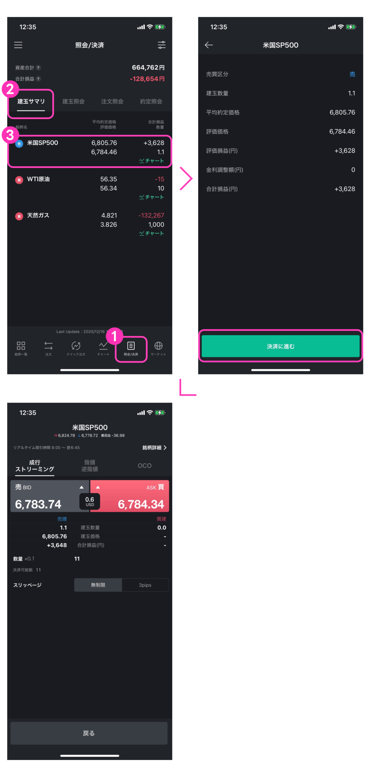 まず照会/決済を選択(①)し、次に建玉サマリを選択(②)すると一覧が表示されます。その中から銘柄を選択(③)することで詳細画面が表示され、決済に進むことができます。
