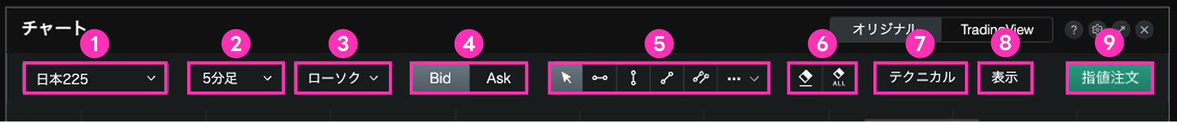 チャートでは、トレンドライン等の描画機能や、各種テクニカル指標でテクニカル分析が行える他、注文の発注や注文・保有建玉の表示等、様々な機能がご利用いただけます。