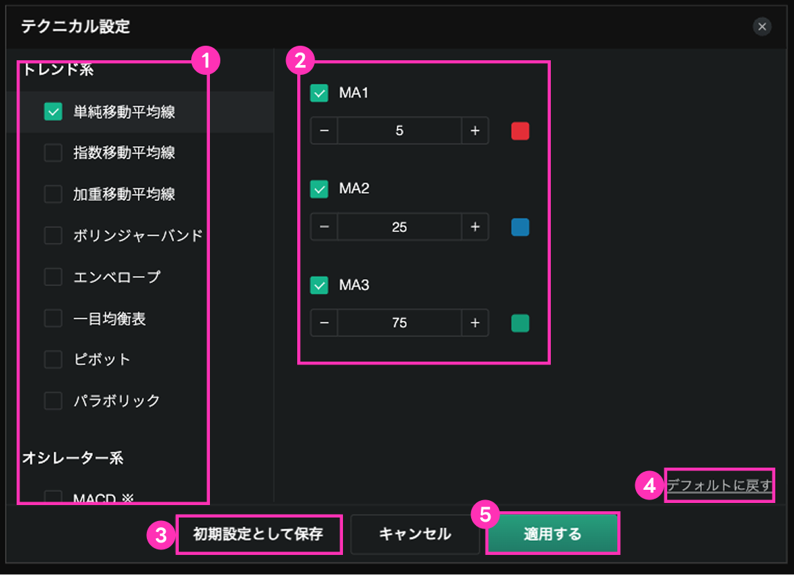 1)左側の一覧からテクニカル指標を選択します。✓をいれたものを実際のチャートに反映します。指標名を選択すると、設定値の確認ができます。設定内容はリアルタイムにチャート上にプレビューされます。確定したい場合は【適用する】を選択することで反映できます。