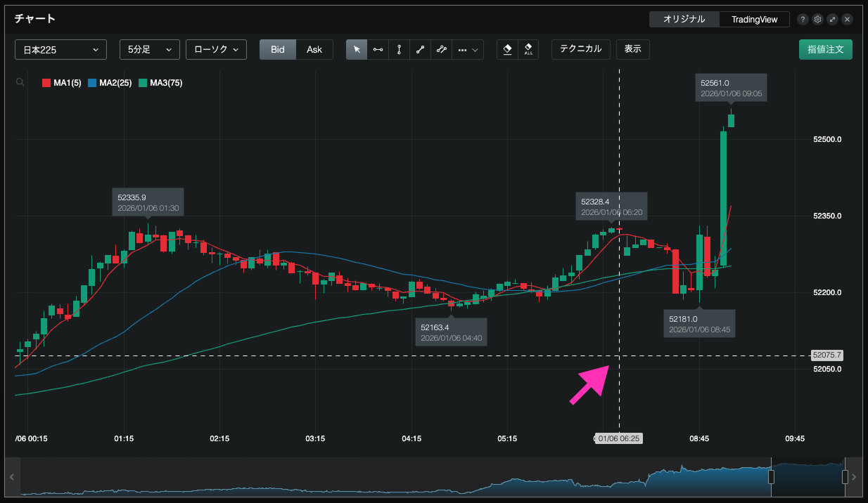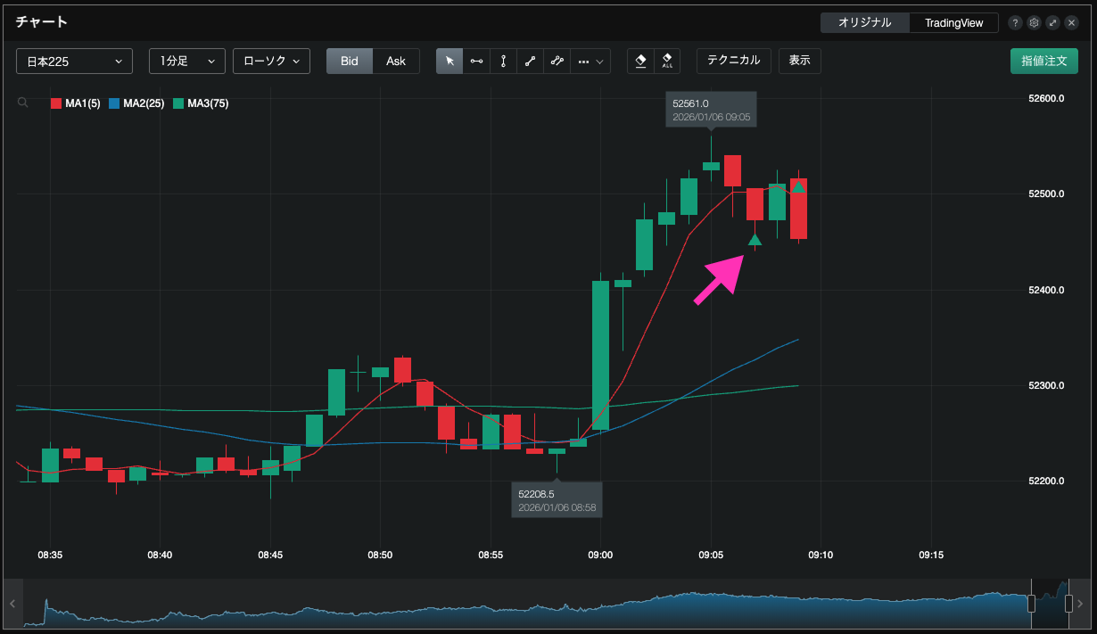 該当の銘柄で保有している建玉が、チャート上の約定タイミングのところでマークが表示されます。