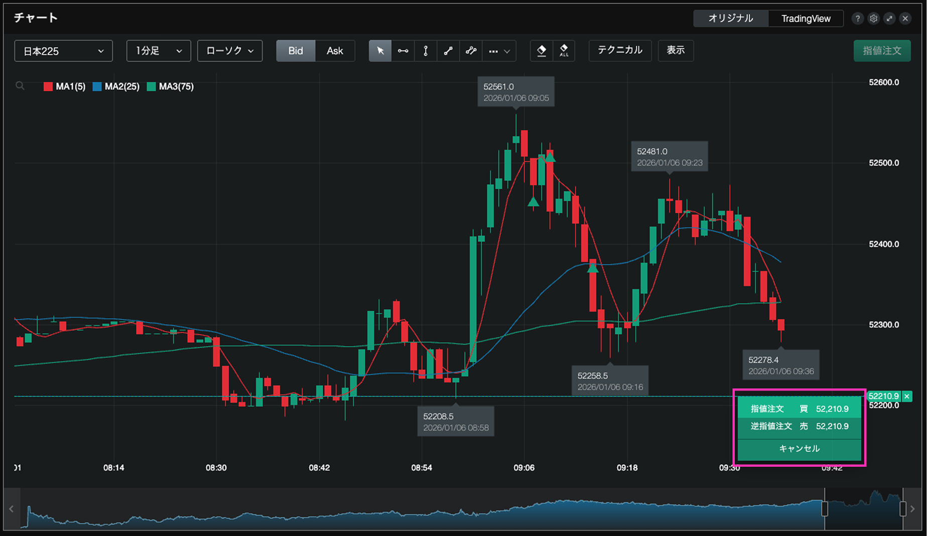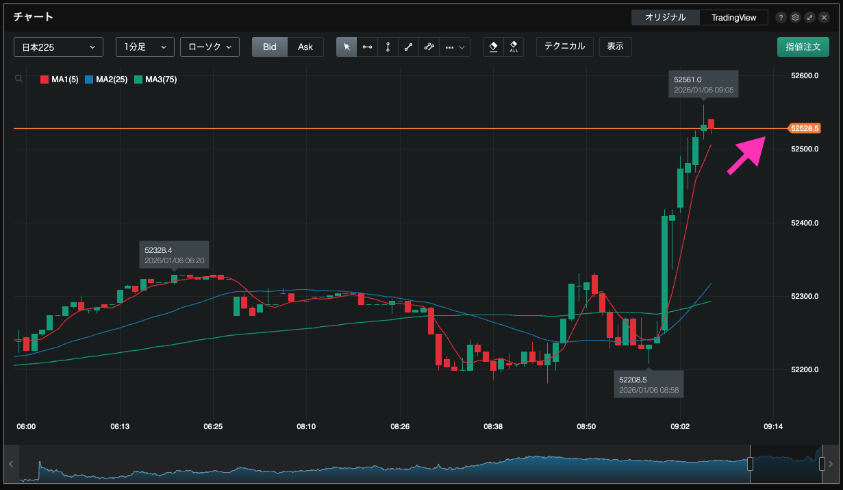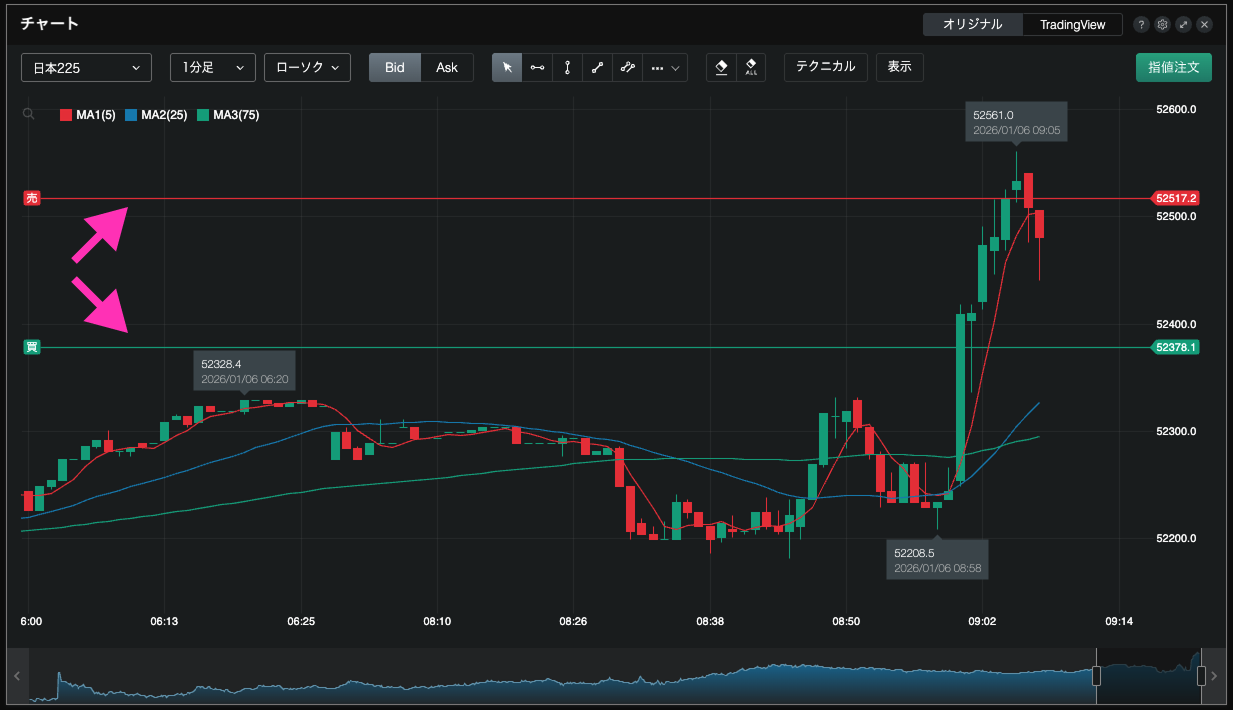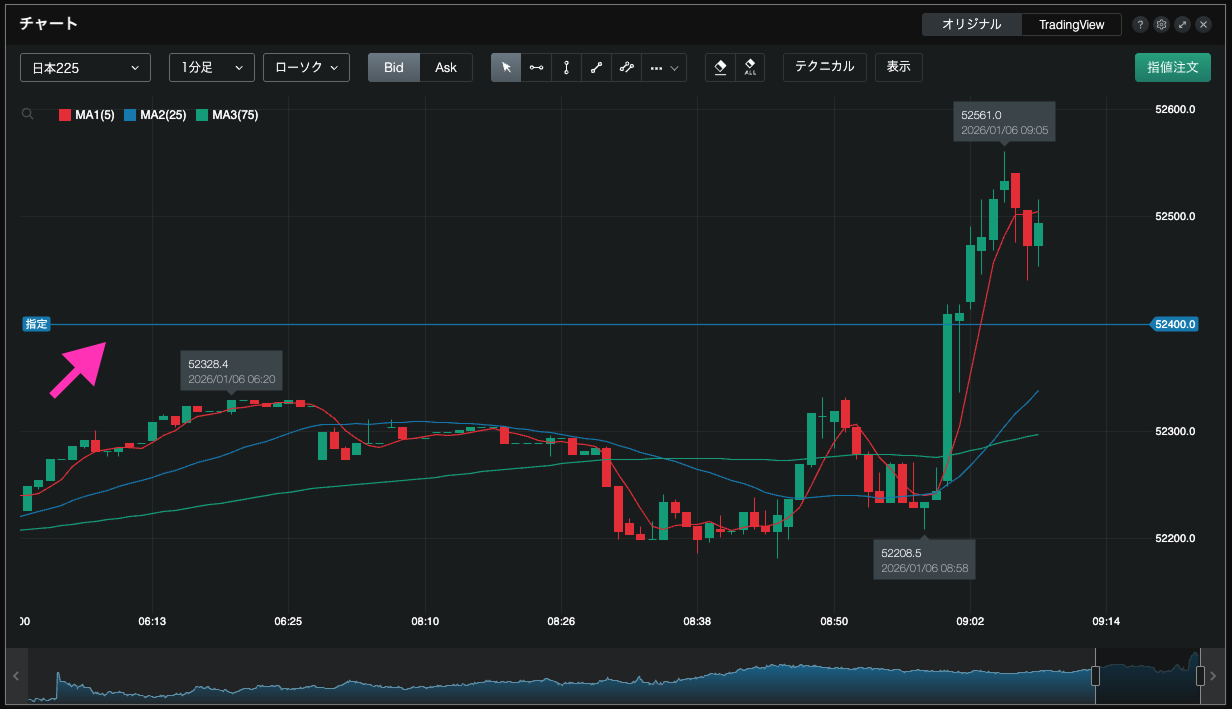 チャート右上の【指値注文】①を選択すると、チャート上のマウスの位置に合わせてライン②が表示されます。マウスの上下で価格の変更ができます。