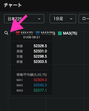 チャートの左上には、表示しているテクニカルチャートの設定値と色が表示されます。