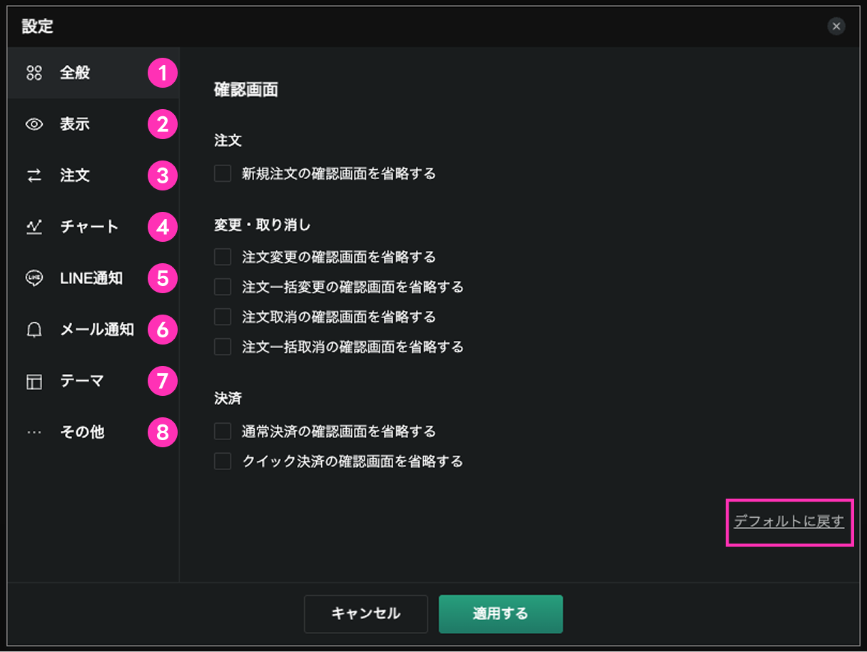 全般設定メニューでは、注文・変更・取消・決済時の各確認画面の省略を設定することができます。
