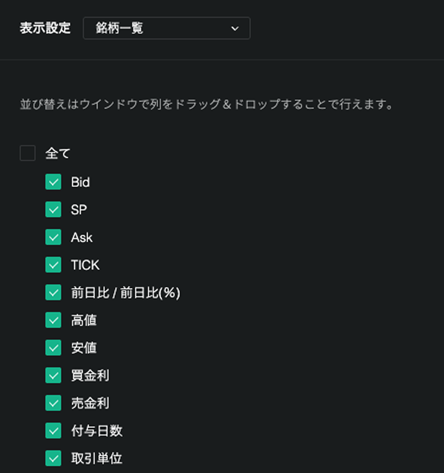 銘柄一覧に表示する通貨ペアと表示順序、表示項目等を設定することができます。
