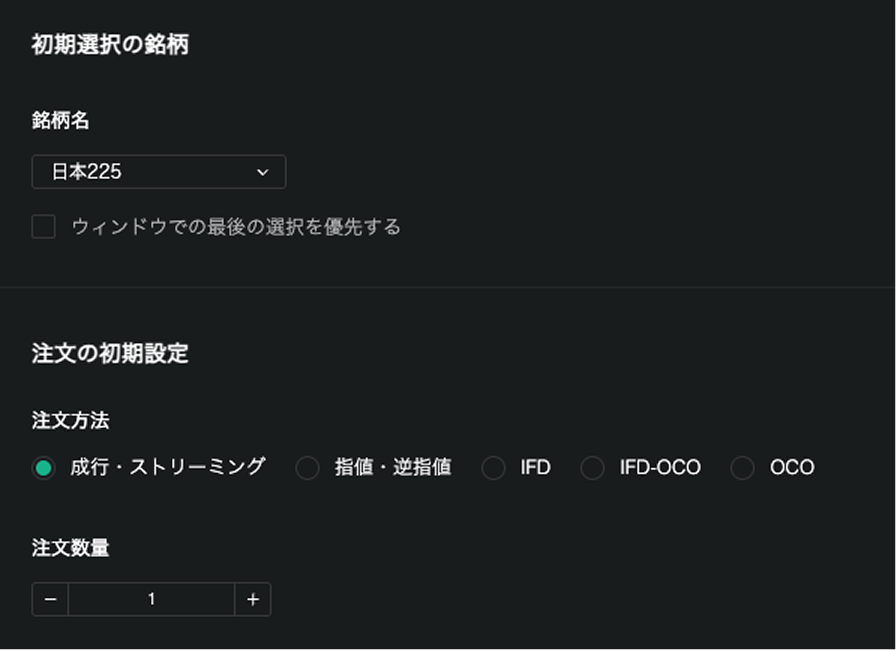 例えば、銘柄の場合、新規注文で最後に選択した銘柄が日本225であれば、日本225が自動的に初期設定として上書き保存され、次回新規注文を開くと日本225が初期選択されている状態になります。