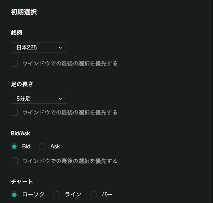 ※「ウインドウでの最後の選択を優先する」にチェックを入れると、前回チャート画面を利用していた際に表示していた内容が表示されます。