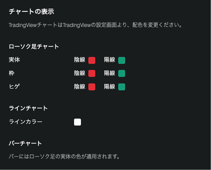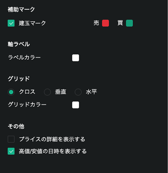 チャートを表示した際の初期表示や、チャートの色、チャート上に描写する線の色を設定することができます。