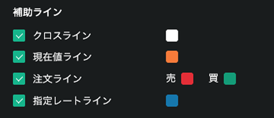 クロスライン、現在値ライン、注文ライン、指定レートラインを表示する際の色合い。