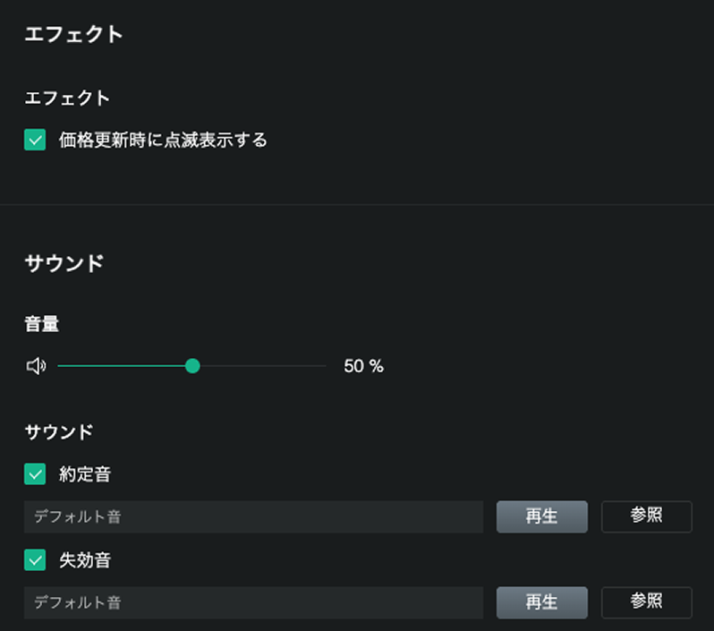 価格更新時の表示方法や約定した際のサウンド等を設定することができます。