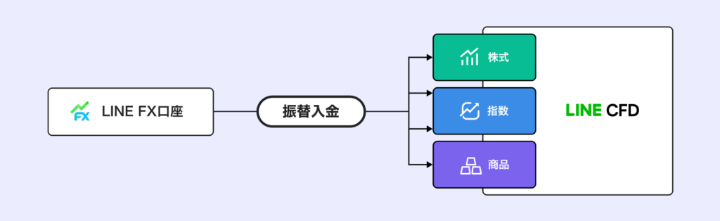 また、LINE CFDの口座は取引対象となる資産の区分に基づき、株式CFD口座、指数CFD口座、商品CFD口座の3つに分かれており、証拠金の入出金、売買損益や証拠金維持率の計算などは各口座ごとにそれぞれ別個の独立した口座として扱われます。