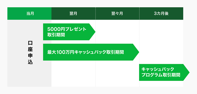 「LINE FX キャッシュバックプログラム」は、FX口座申込月の3カ月後から開始となります。口座申込月の翌々月末までは「新規口座開設特典」の対象となります。