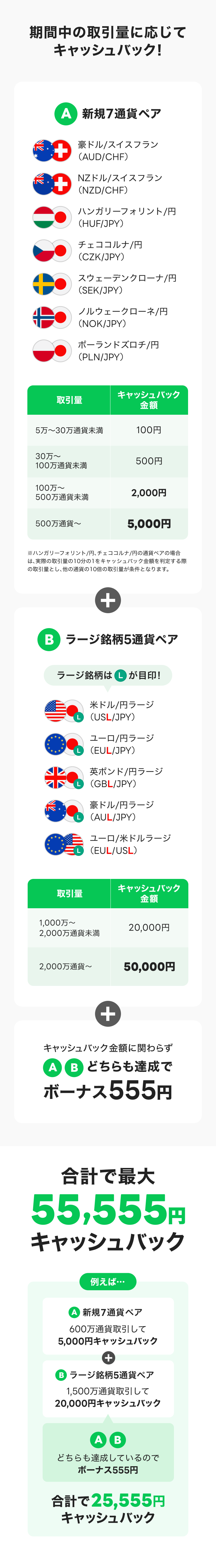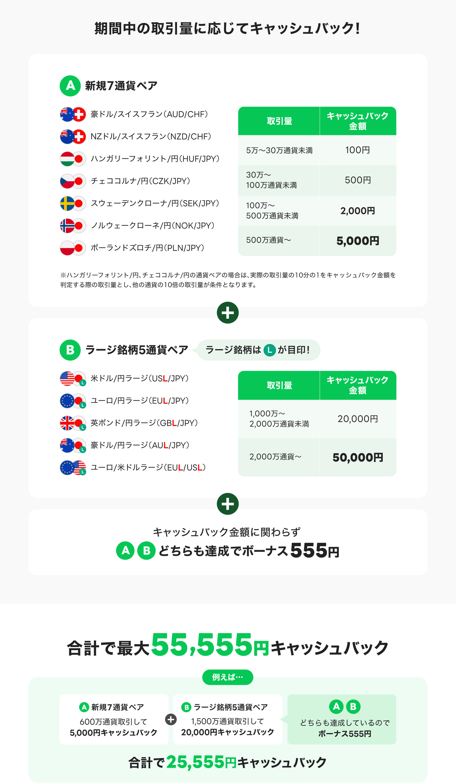 ※ハンガリーフォリント/円、チェココルナ/円の通貨ペアの場合は、実際の取引量の10分の1をキャッシュバック金額を判定する際の取引量とし、他の通貨の10倍の取引量が条件となります。