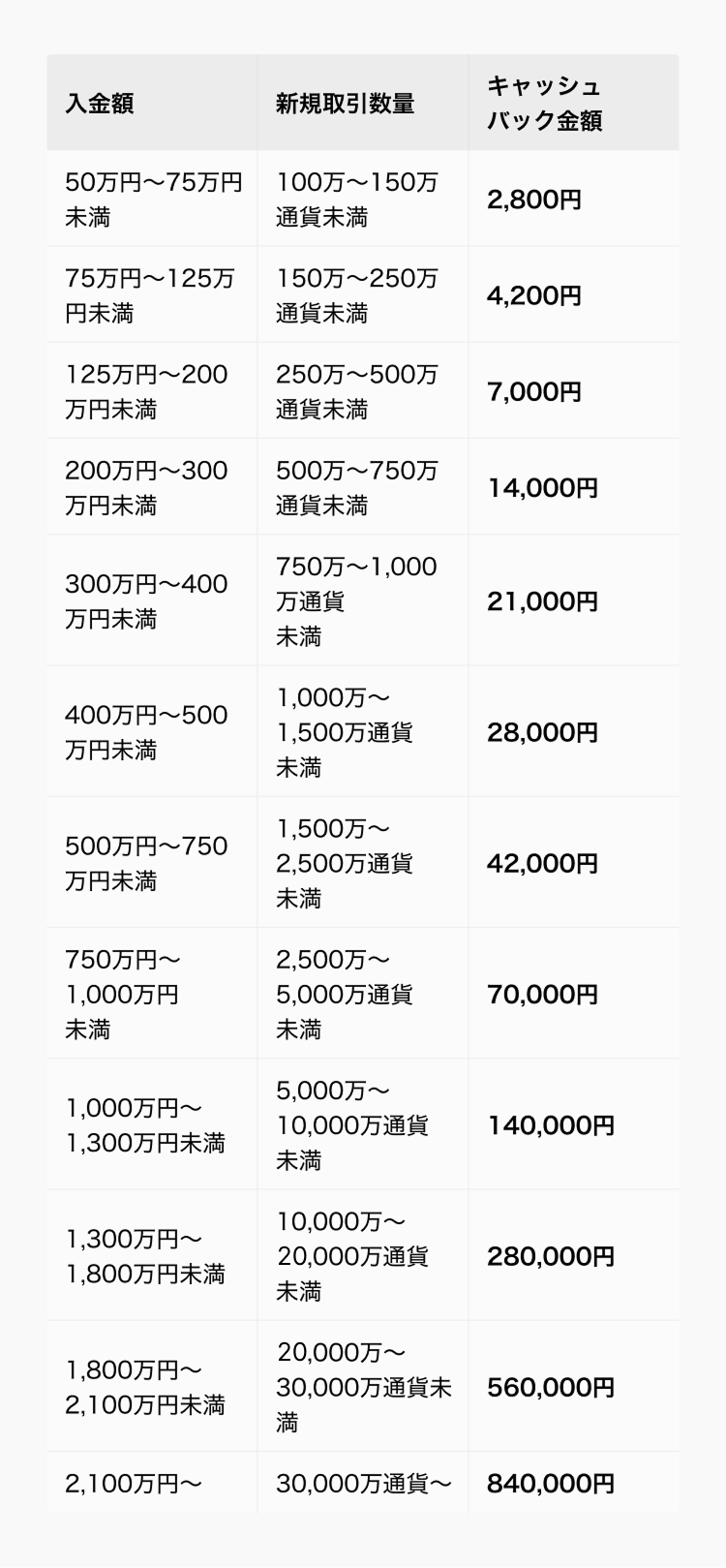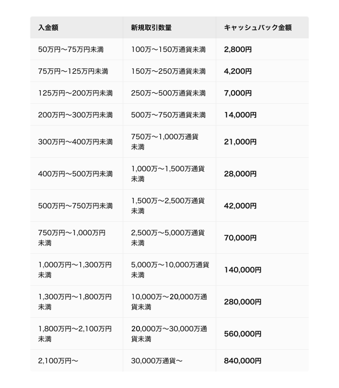 キャンペーン期間中の、入金額※および対象の通貨ペアの新規取引数量の合計に応じて、下表のとおりキャッシュバックいたします。