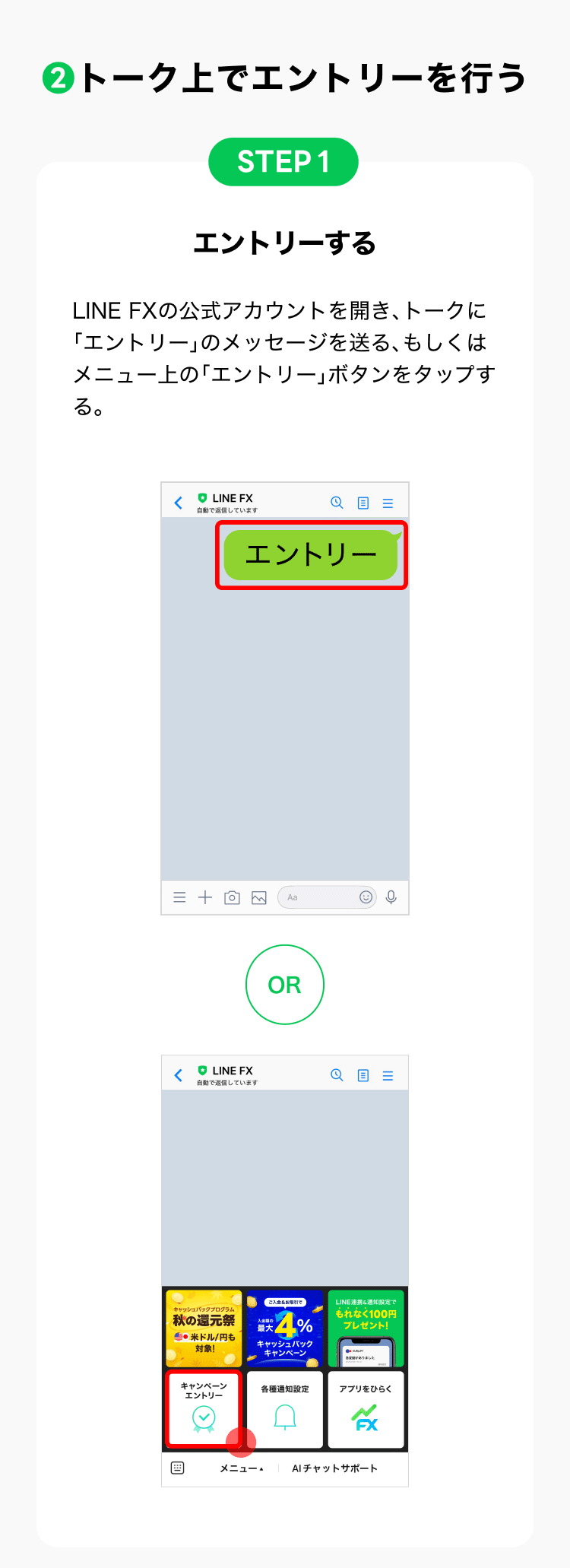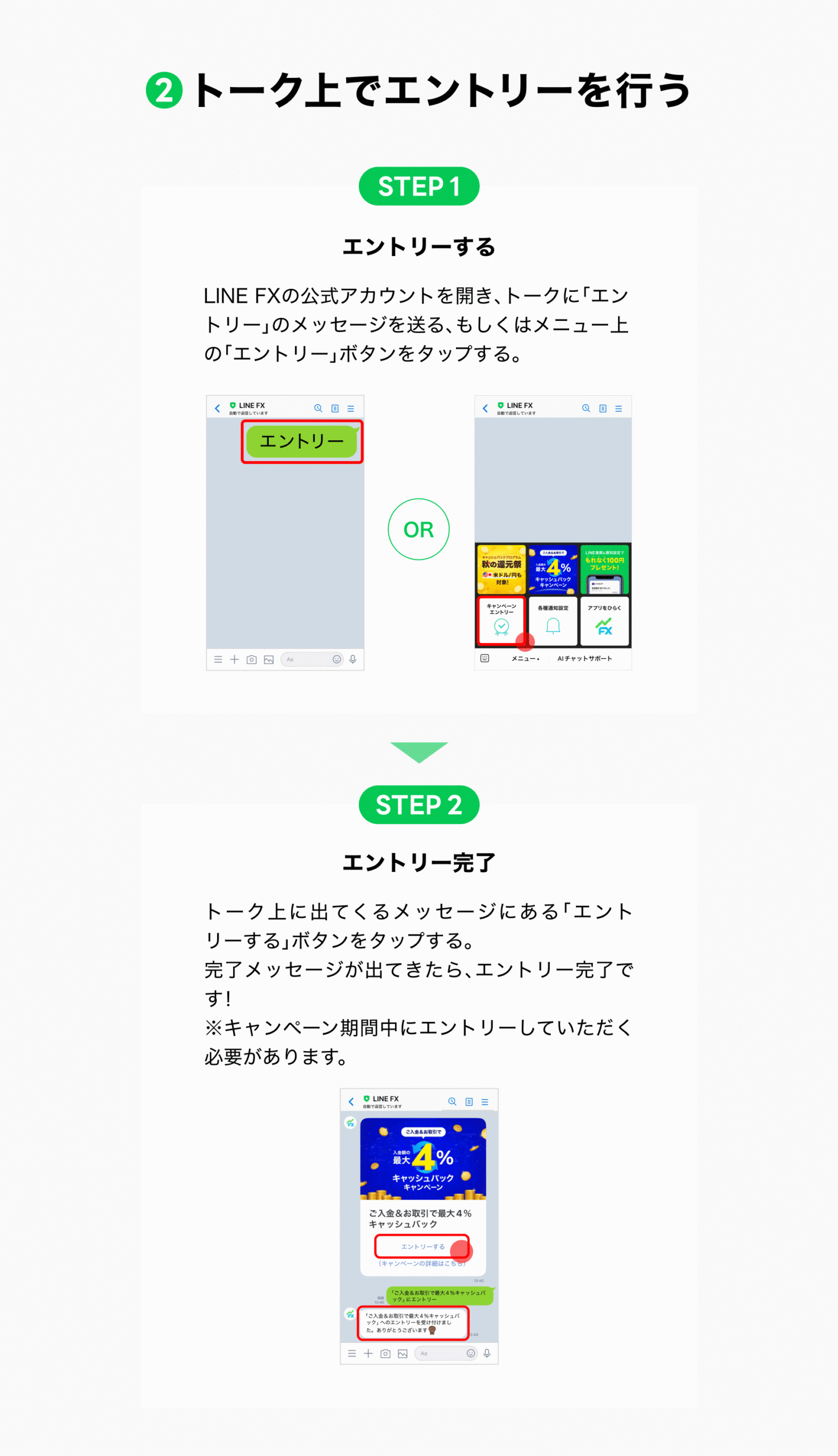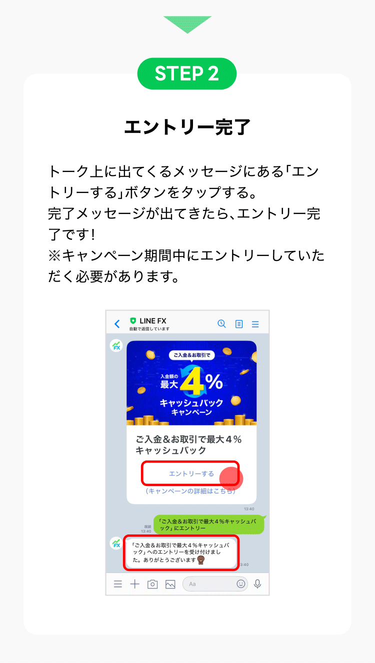 ※特典付与までに、LINE連携を解除された場合は対象外になりますのでご了承ください。 - キャンペーン期間中に、トーク上でエントリー完了メッセージが表示されること