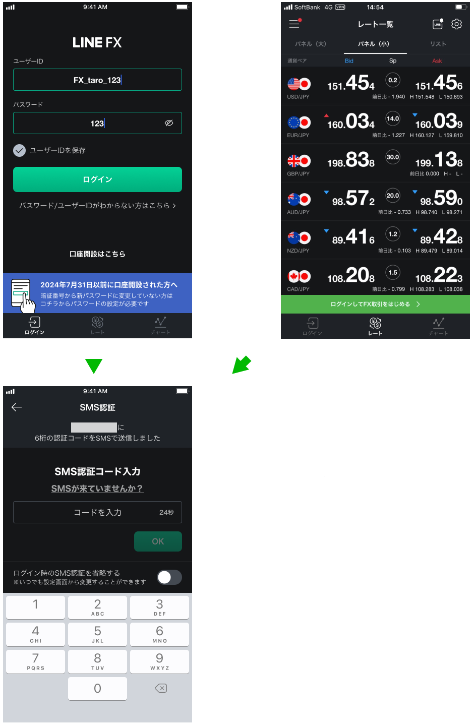 LINE FX アプリ操作マニュアル ログイン方法 2024年5月24日 目次へ戻る ログイン方法 初めてLINE FXアプリを起動するとレートがめんが表示されます。LINE FX口座開設済みの場合、ナビゲーションの【ログイン】からお持ちのユーザーIDとパスワードを入力してください。次の画面でご登録の電話番号にSMSが送信されますので、SMSに記載の6桁の認証コードを入力してください。このSMS認証は次回からスキップすることも可能です。認証コード入力前に「ログイン時のSMS認証を省略する」のボタンをONにしてください。 目次へ戻る 12