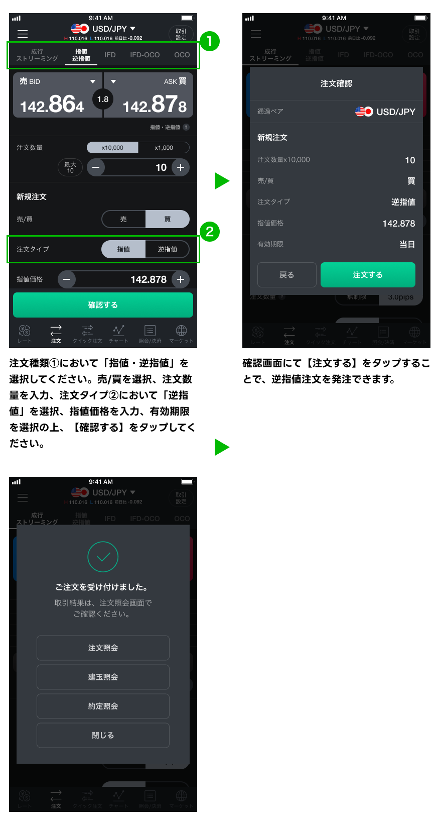 LINE FX アプリ操作マニュアル 逆指値注文 2024年5月22日 目次へ戻る 逆指値注文 注文価格(逆指値価格)を指定して発注する注文方法です。 ※決済同時発注については、こちらをご確認ください。 目次へ戻る