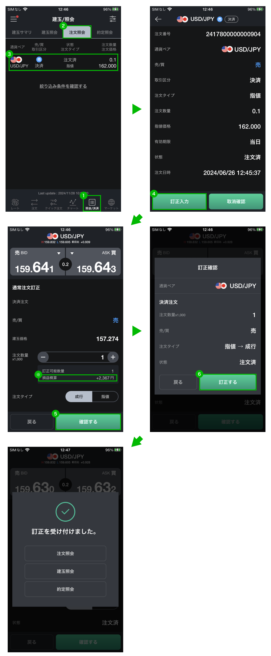 注文の訂正は、注文照会画面より、訂正したい注文をタップして表示される「注文詳細」画面よりできます。