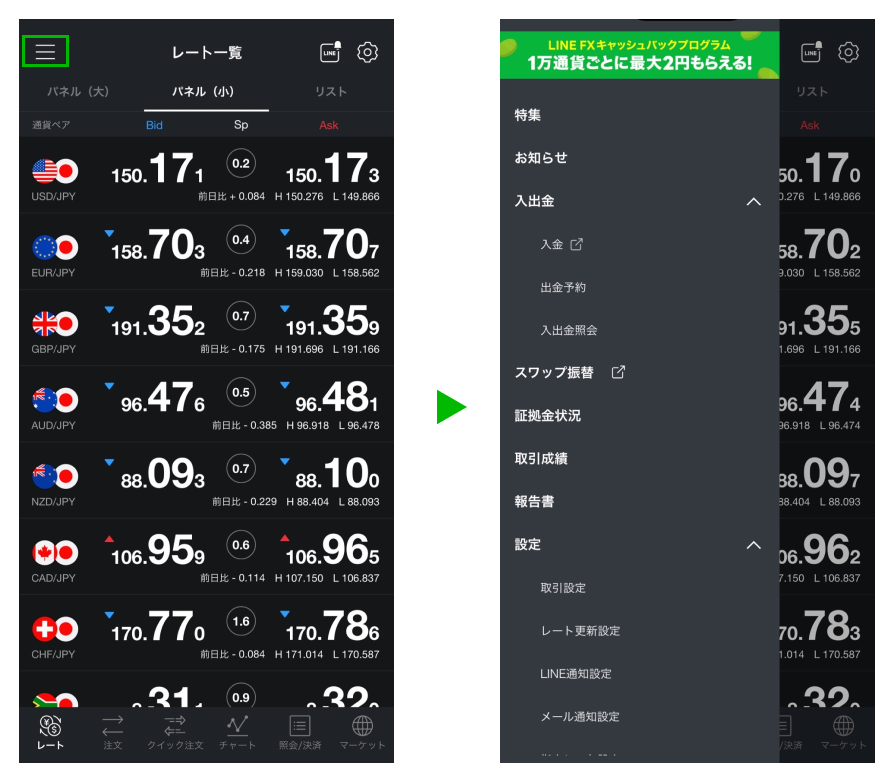 画面左上のメニューボタンをタップすることで、メニューが表示されます。