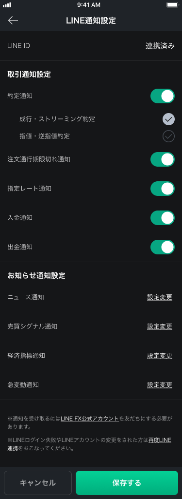 画面左上で「設定」>「LINE通知設定」をタップすることで、LINE通知を行う設定や設定解除をすることができます。
