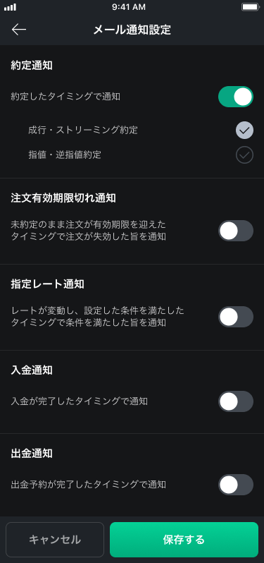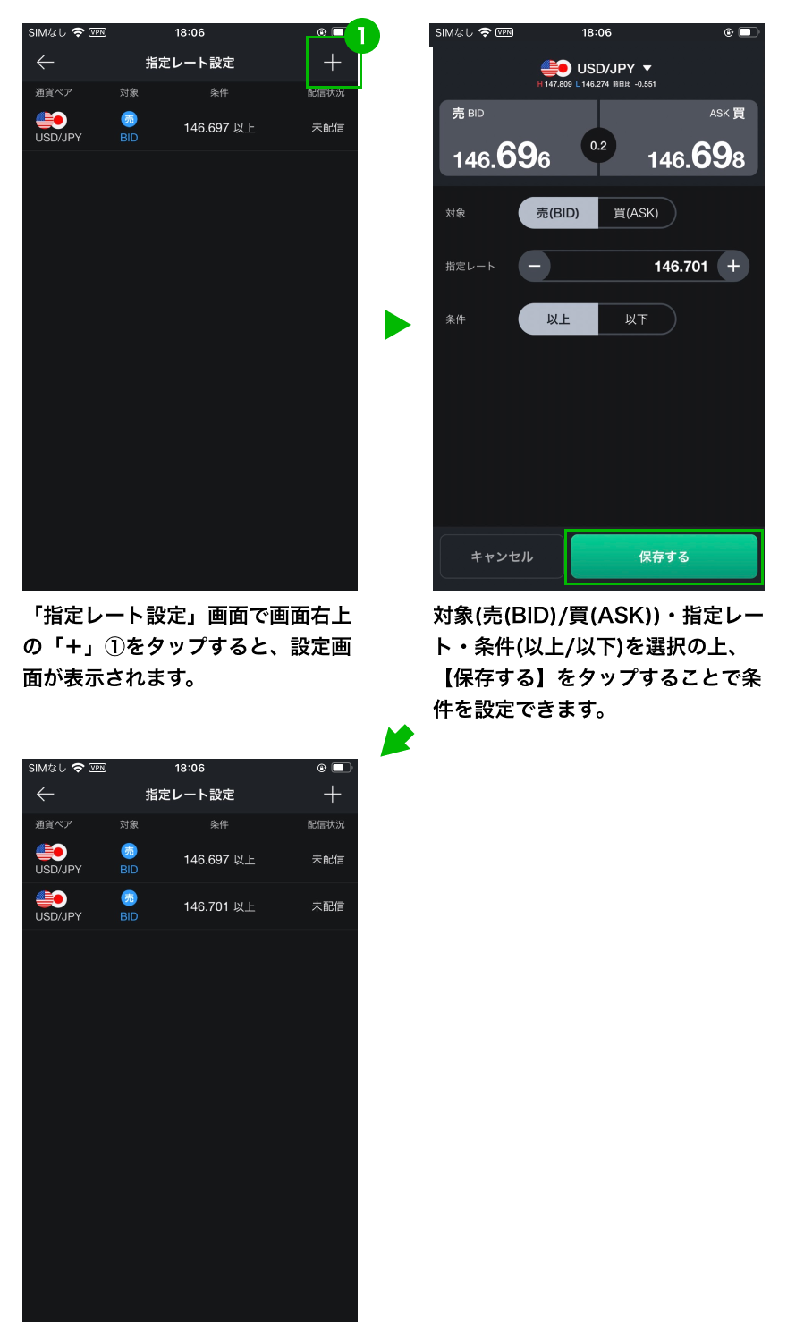 画面左上で「設定」>「指定レート設定」をタップすることで、レートが指定した条件に合致した場合にLINE通知/メール通知を送信することができます。