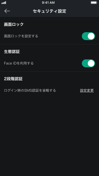 画面左上で「設定」>「セキュリティ設定」をタップすることで、LINE FXアプリを起動した際の画面ロックの設定を行うことができます。生体認証の設定を行うこともできます。