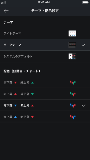 画面左上で「設定」>「配色設定」をタップすることで、上昇・利益と下降・損失の際のチャート等の配色を設定できます。