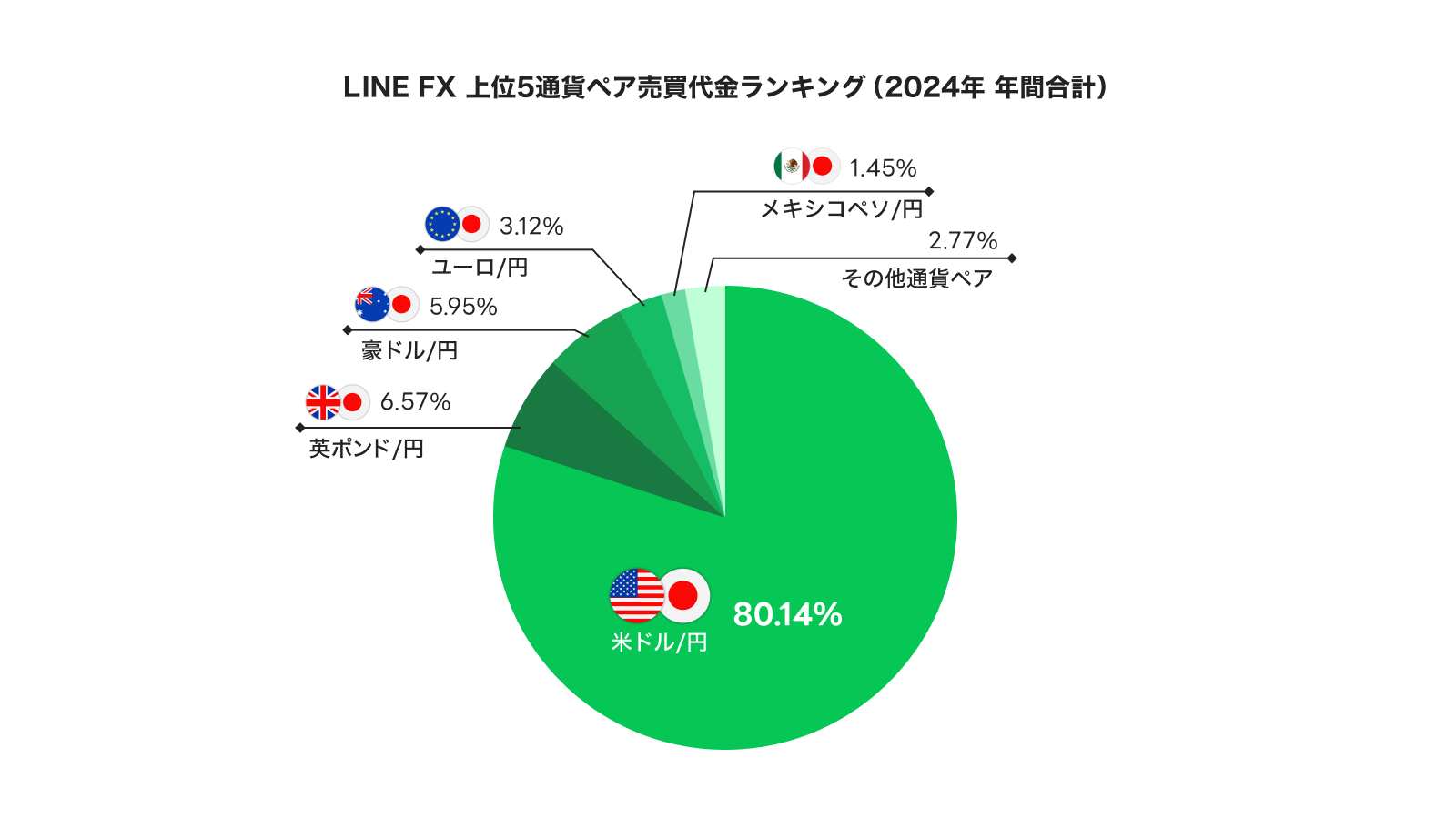 LINE FXの上位5通貨ペアの売買代金ランキング(2024年の年間合計)は、以下になっています。米ドル/円の売買代金が圧倒的に多く、続いて英ポンド/円、豪ドル/円、ユーロ/円、メキシコペソ/円の順になっています。