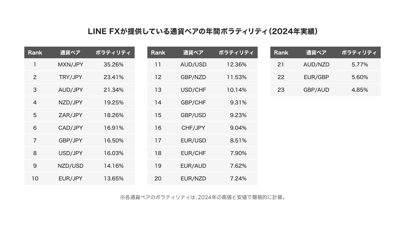 LINE FXが取り扱っている通貨ペアの2024年のボラティリティ一覧は次の通りです。