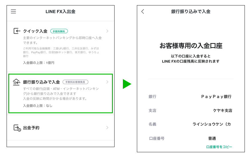 お客さまごとに「お客様専用の入金口座」をご用意しております。ご自身の銀行口座から、表示されている入金口座に銀行振り込みを実施することで、LINE FXの口座残高に反映されます。