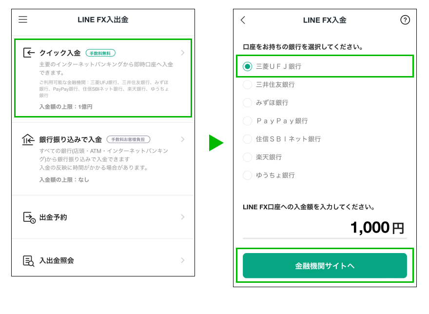 LINE FXでは提携金融機関のインターネットバンキングから即時入金ができるクイック入金もしくは銀行振込で入金が可能です。