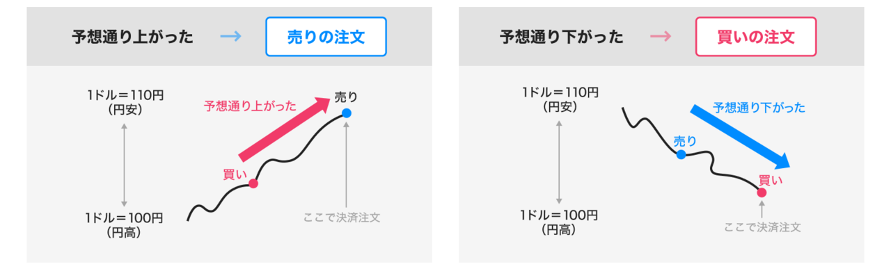 「買い」の新規注文で始めて、価格の上昇が予想通りだった場合は「売り」の決済注文、「売り」の新規注文で始めて、価格の下落が予想通りだった場合は「買い」の決済注文を出して損益を確定させます。