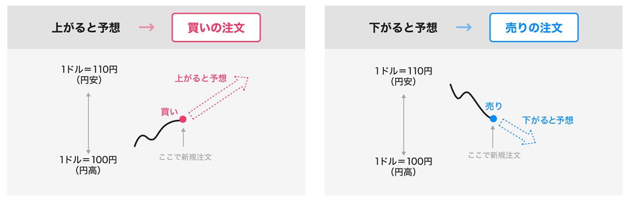 価格の上昇を予想する場合は、買った値段よりも高い値段で売る取引になるため、「買い」の新規注文を出します。価格の下落を予想する場合は、売った値段よりも低い価格で買い戻す取引になるため「売り」の新規注文を出します。