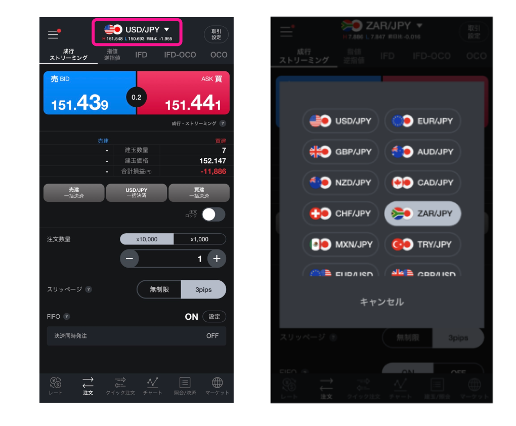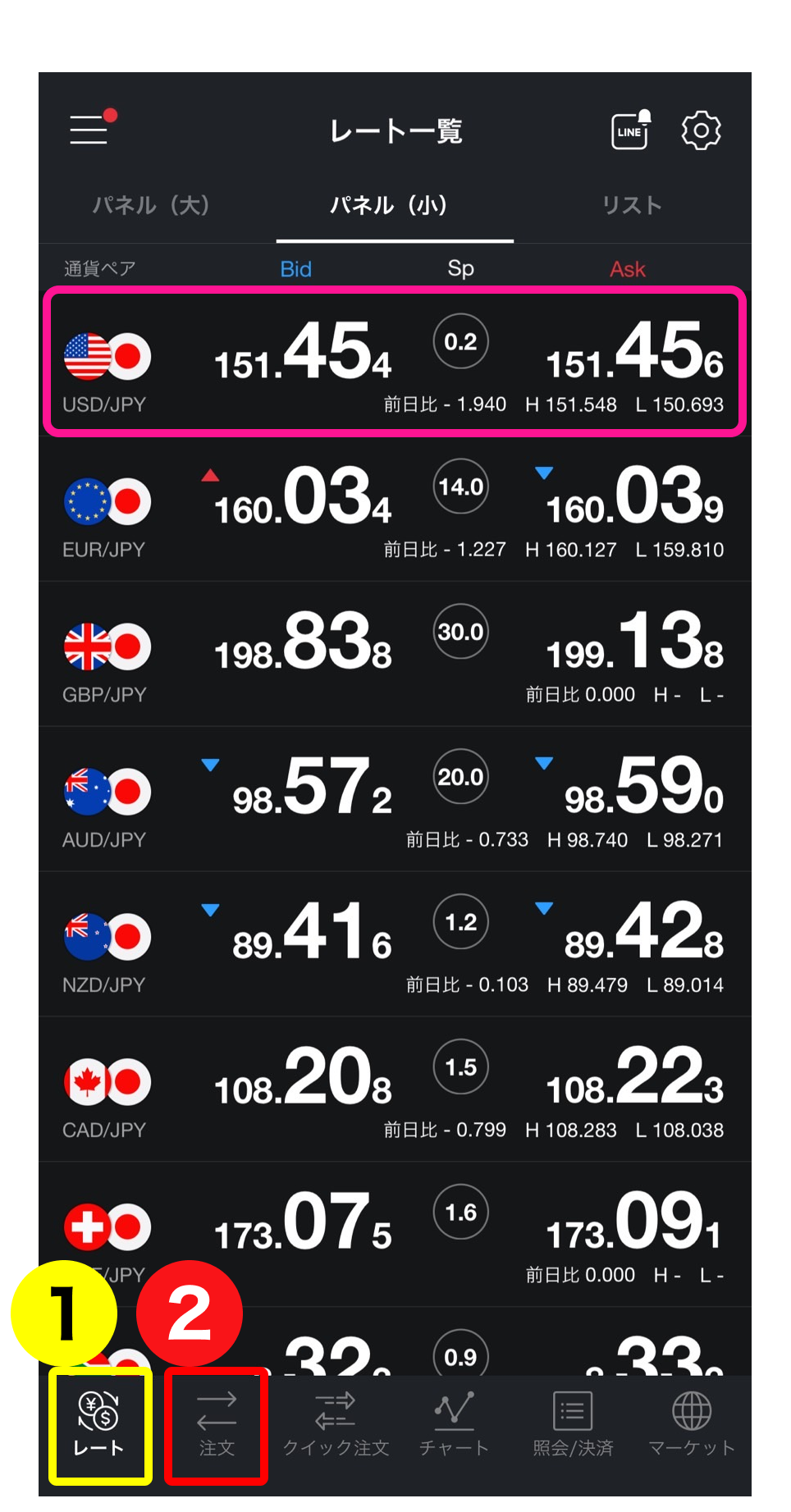 ①レート一覧もしくは②注文画面から新規注文したい通貨ペアを選択