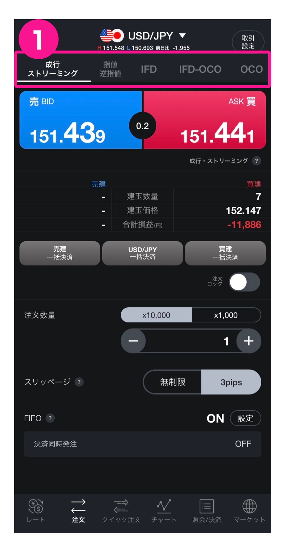 ①のエリアで注文方法の選択が可能。「成行ストリーミング」を選択