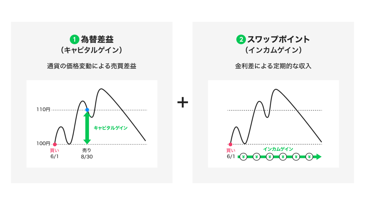 「為替差益」(キャピタルゲイン)と「スワップポイント」(インカムゲイン)について、次から詳しく見てみましょう。