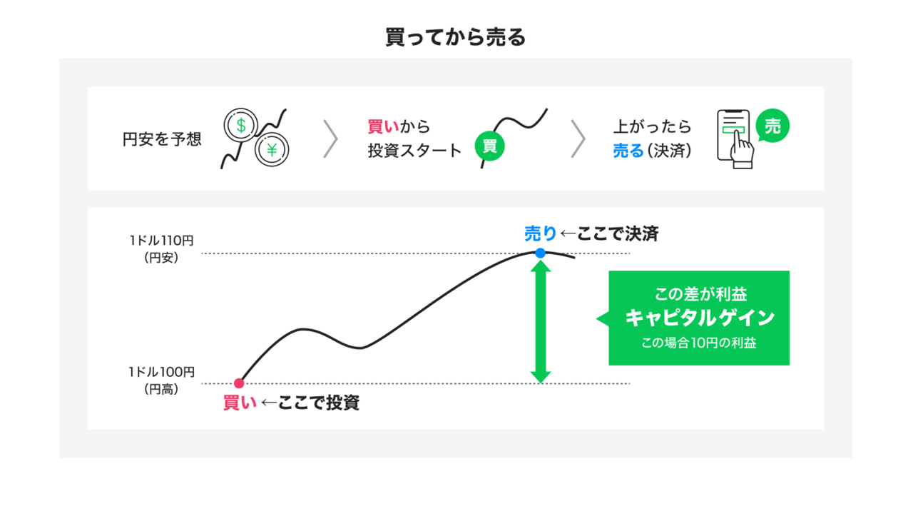 よって、今後の為替が上がるのか・下がるのかを予測して、買いもしくは売りのどちらかを行い利益を狙います。今後の為替が上がりそうと思ったら「買い」を行い、為替が下がりそうと思ったら「売り」を行うことがFXの基本になります。